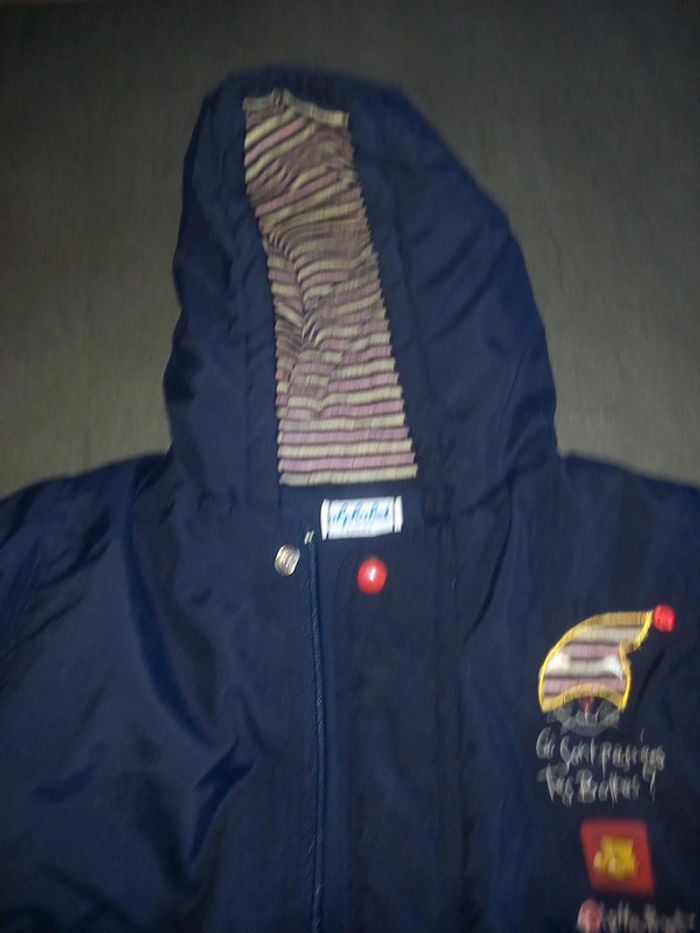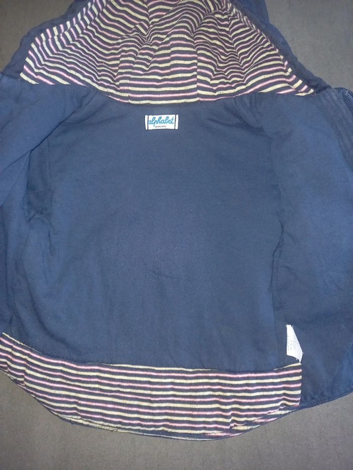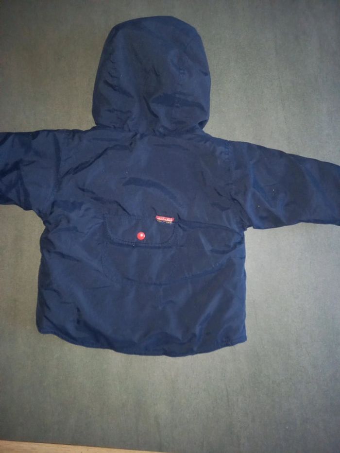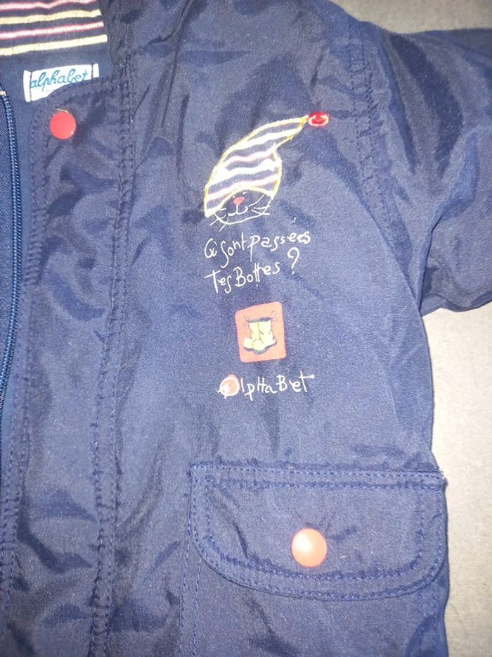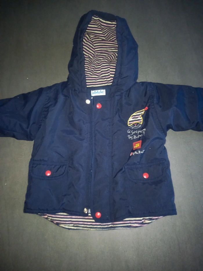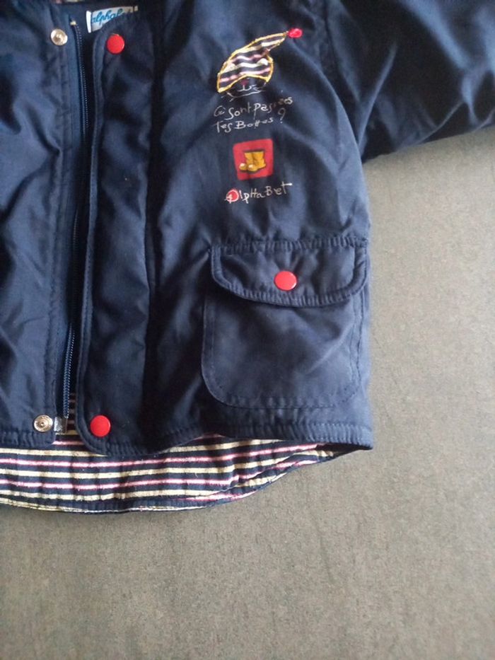 Comme neuf, en excellent état, il est bien épaisse et chaud , entièrement doublé, fermeture zippée fonctionne parfaitement et 2 boutons pression sur le devant. 2 poches côtés Capuche avec élastique Trop mignon une petite poche dans le dos ! Marine et détails rouges