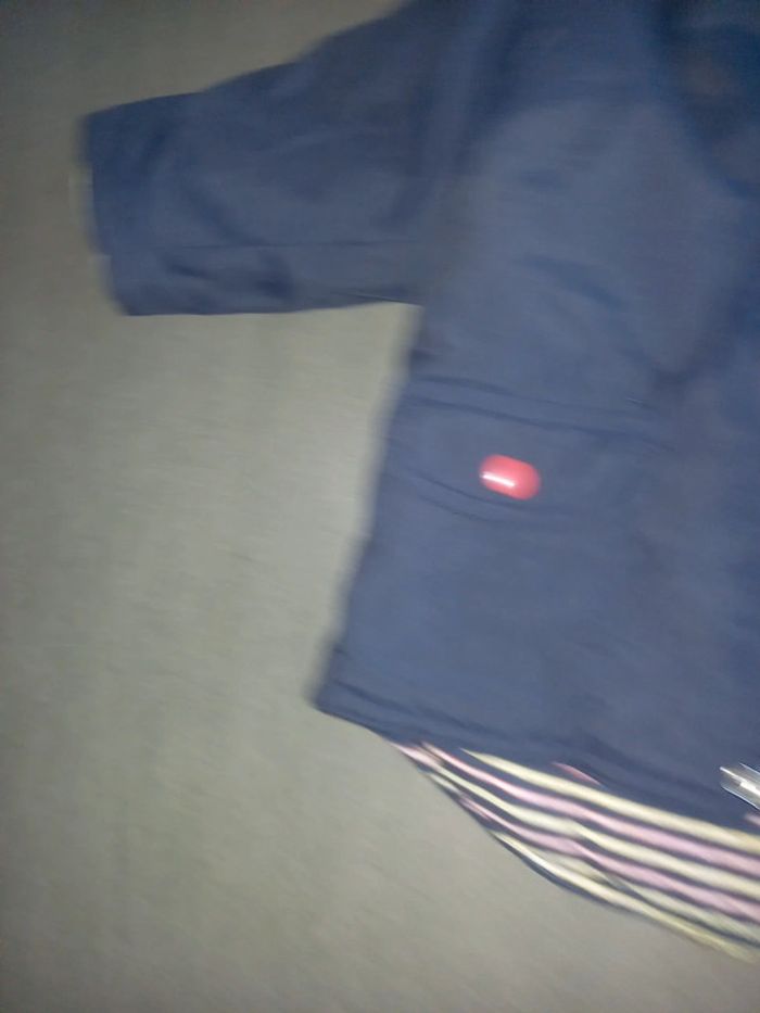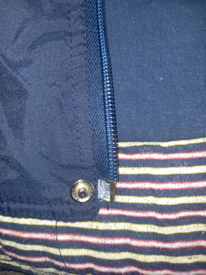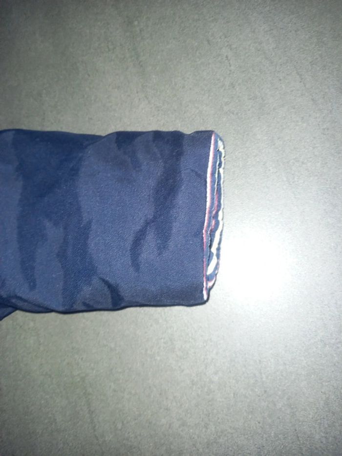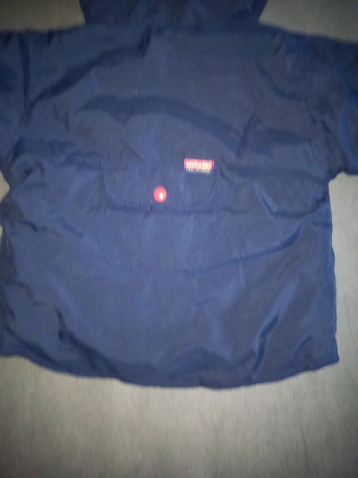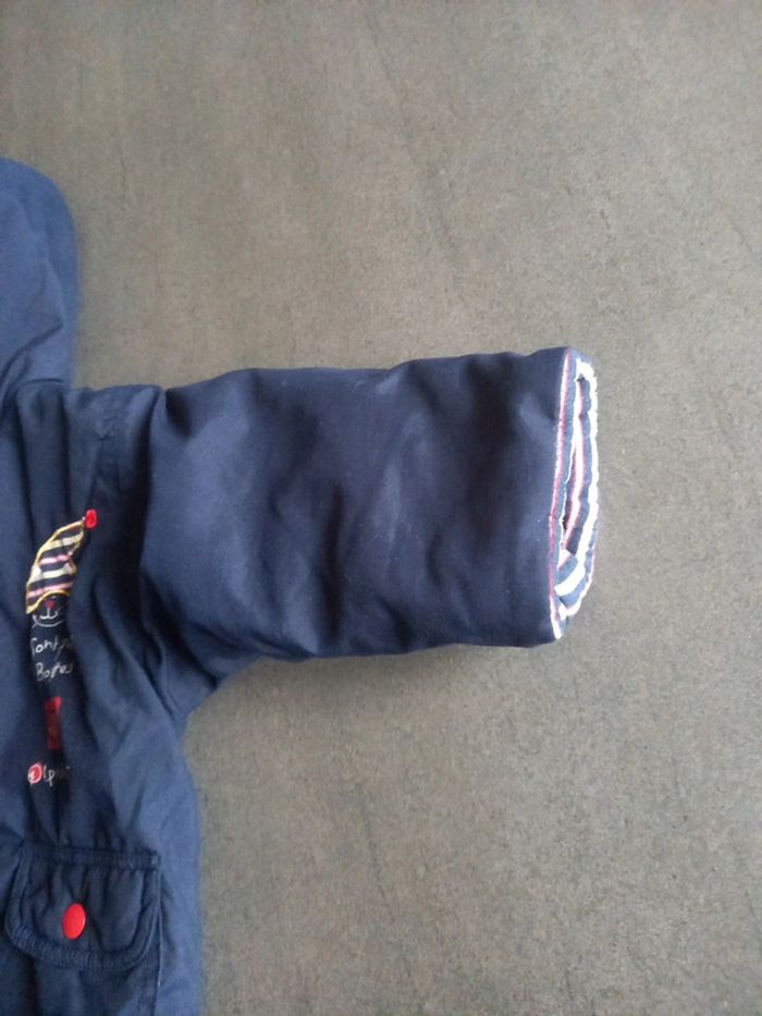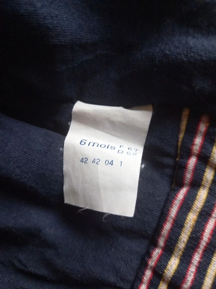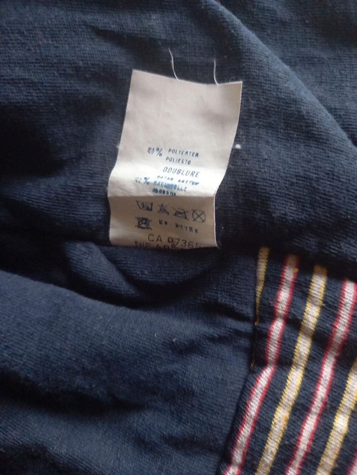 Comme neuf, en excellent état, il est bien épaisse et chaud , entièrement doublé, fermeture zippée fonctionne parfaitement et 2 boutons pression sur le devant. 2 poches côtés Capuche avec élastique Trop mignon une petite poche dans le dos ! Marine et détails rouges