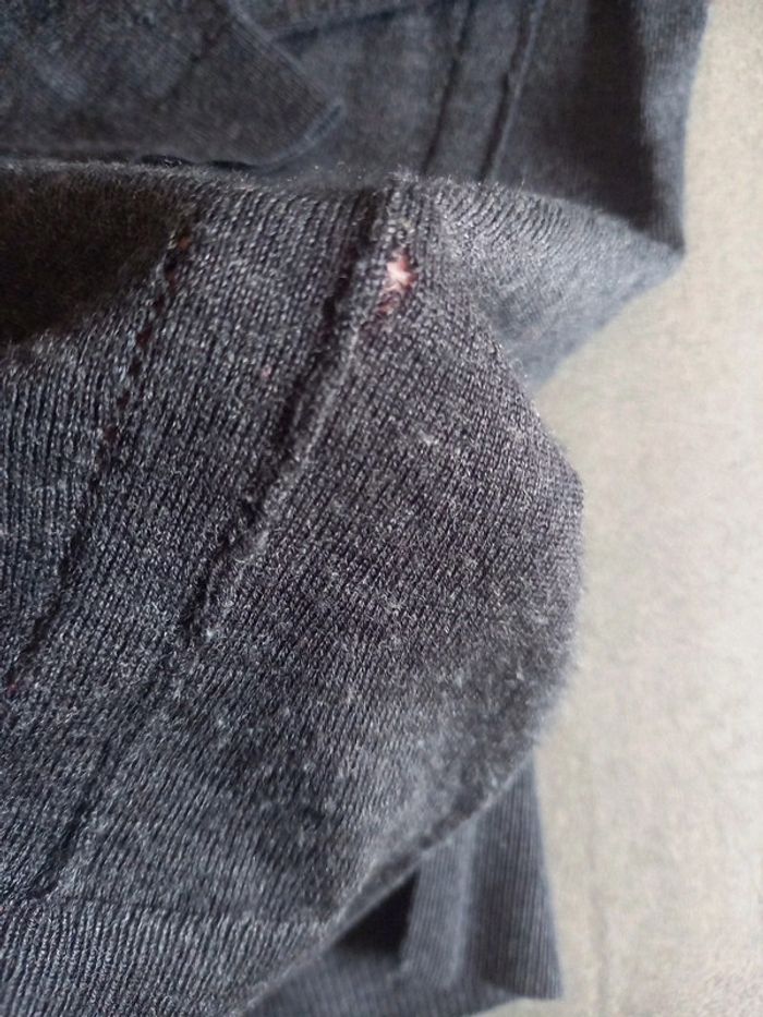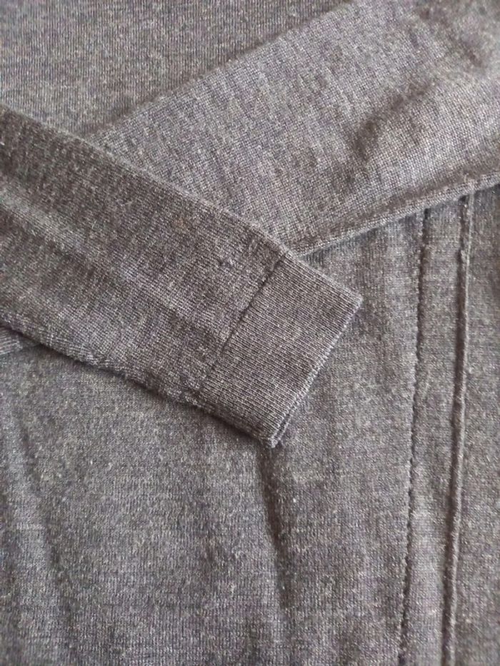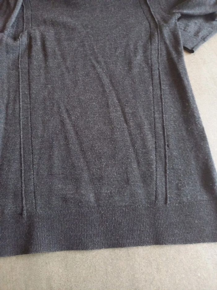 Pull très peu porté en pure laine mérinos, lavable en machine, pas de bouloches ni traces d'usure , belle qualité, j'ai fait 1 léger accroc en bas voir photo facilement rattrapable avec 1 petit point, mais je préfère le vendre en l'état à petit prix , acheté 69 euros. Style pull tunique longueur 63 cms Col rond