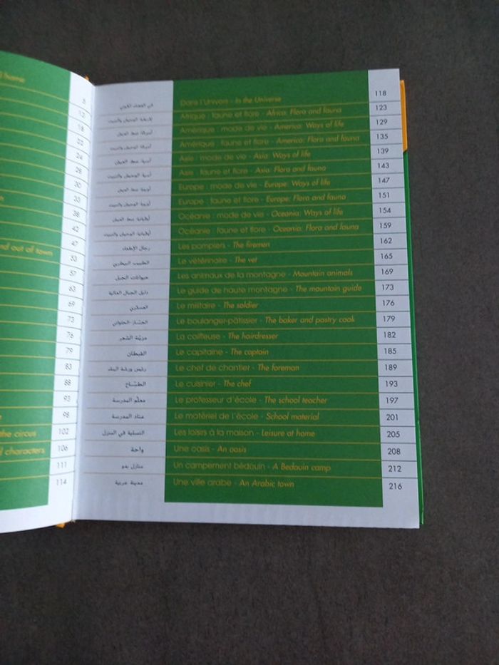 Livre proche du neuf, 219 pages suivi d'un lexique pour retrouvé les mots Éducatif et ludique, les mots et expressions sont présents en Français, Arabe et Anglais avec de jolies illustrations Couverture rigide cartonnée 2000 mots et expressions classes par domaine ( école, maison, loisirs, cinéma, cirque, à la plage , au super marché...) Hauteur 28 cms Largeur 20 cms Épaisseur 2.4 cms