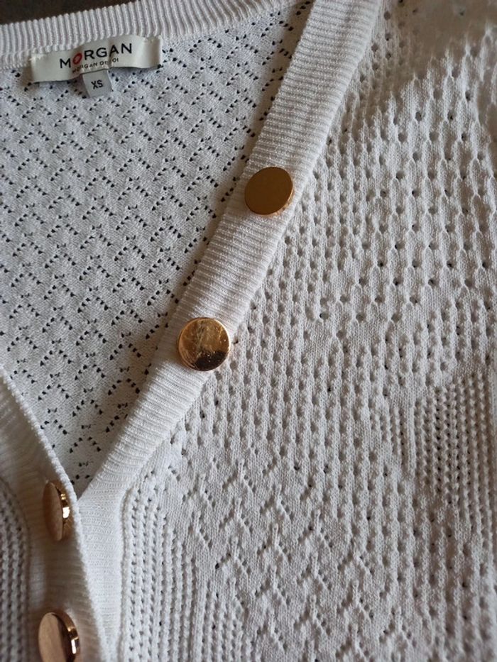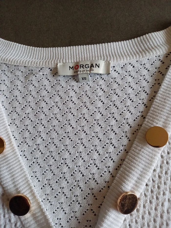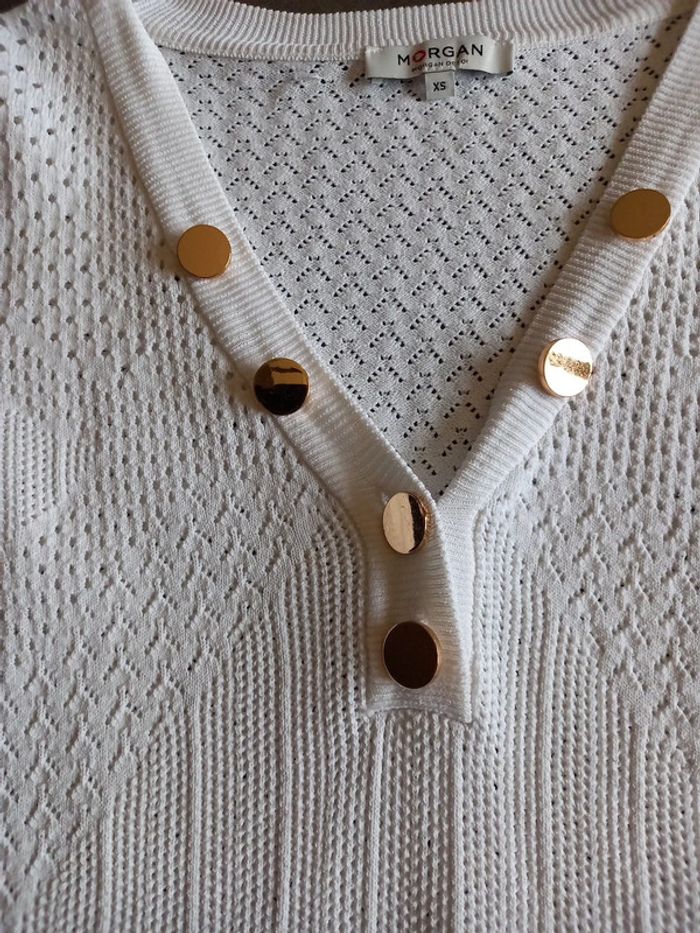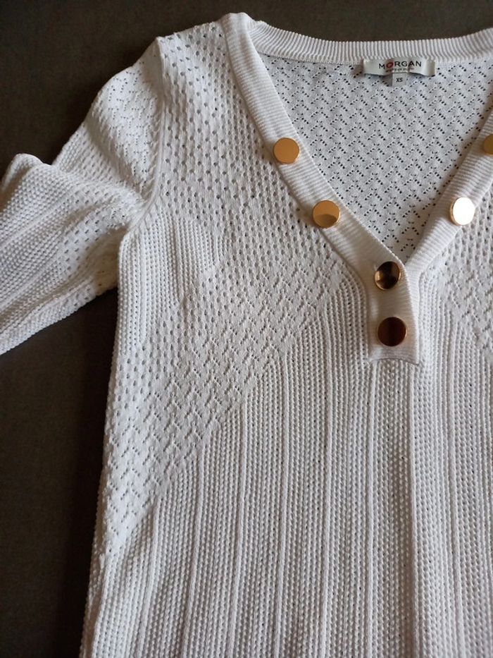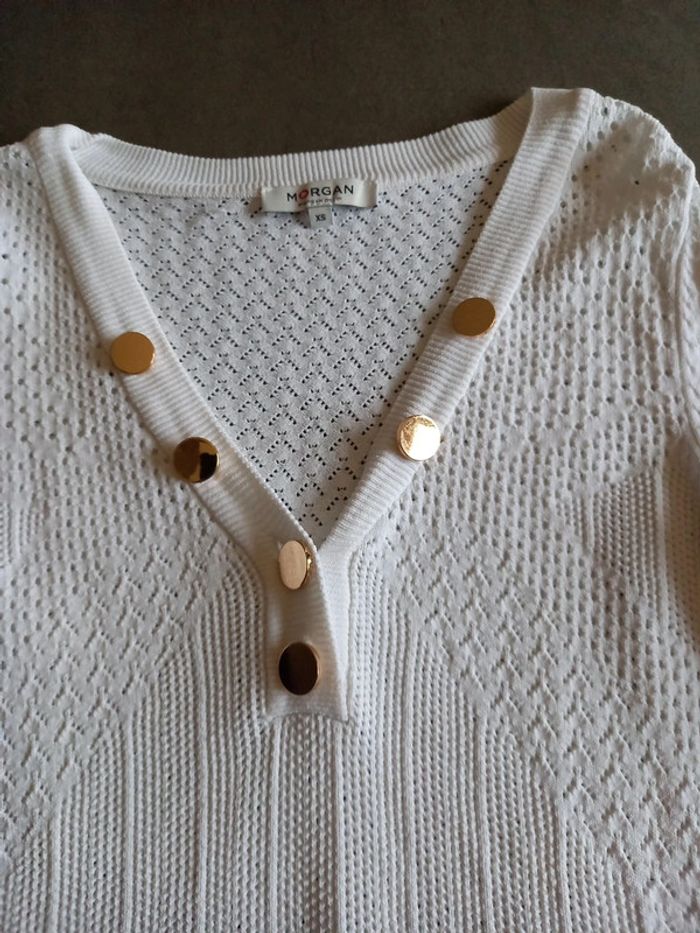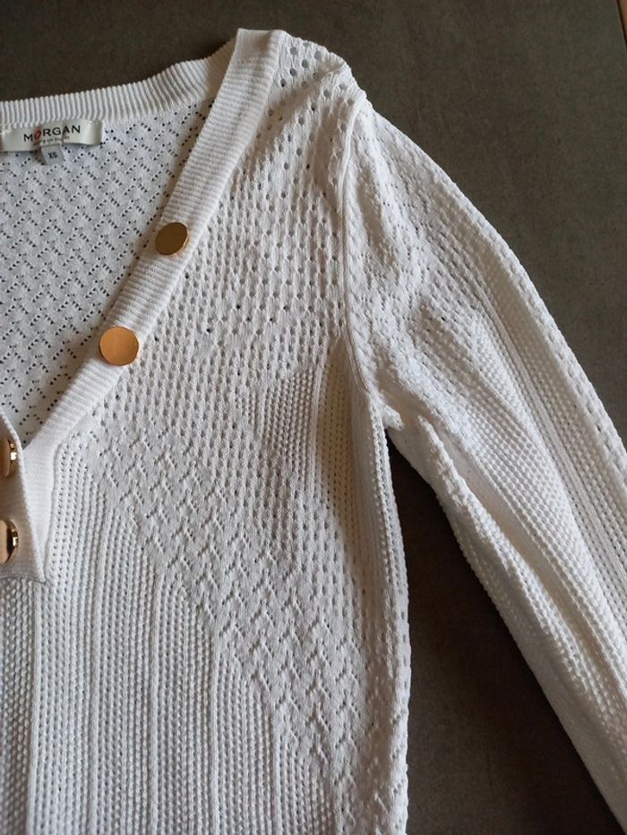 Pull blanc col V avec boutons dorés Les 2 boutons du bas peuvent être ouverts pour 1 décolleté plus plongeant. Peu porté en excellent état Haut , dos et manches style crochet dentelle Très élégant Longueur 60 cms Largeur épaules 36 cms de couture à couture Longueur manches 59 cms Belle Confection de la marque Morgan Se lave en machine