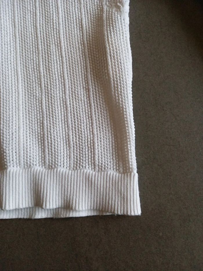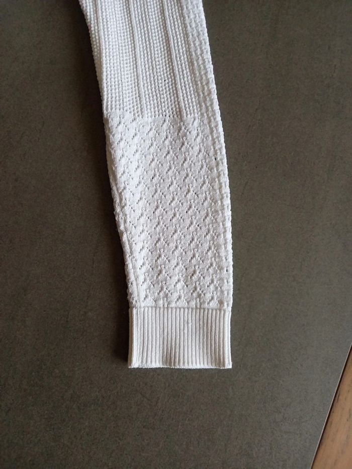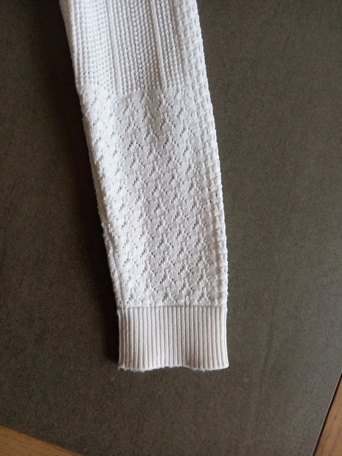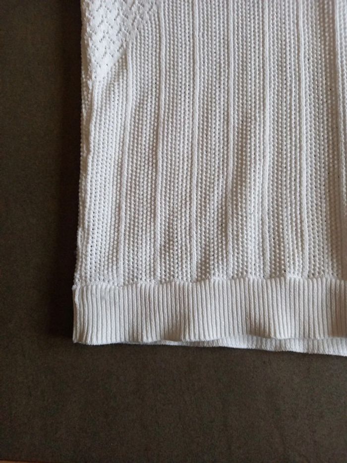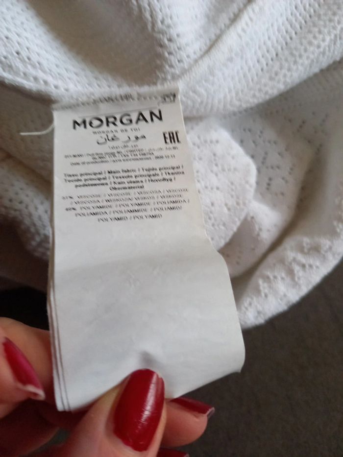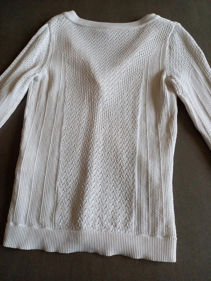 Pull blanc col V avec boutons dorés Les 2 boutons du bas peuvent être ouverts pour 1 décolleté plus plongeant. Peu porté en excellent état Haut , dos et manches style crochet dentelle Très élégant Longueur 60 cms Largeur épaules 36 cms de couture à couture Longueur manches 59 cms Belle Confection de la marque Morgan Se lave en machine