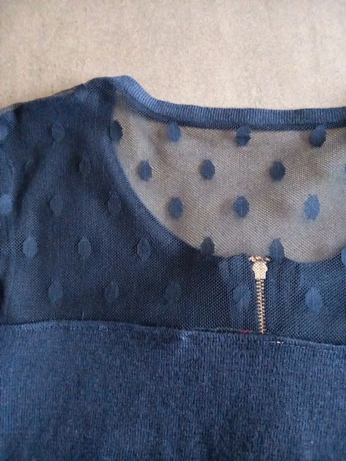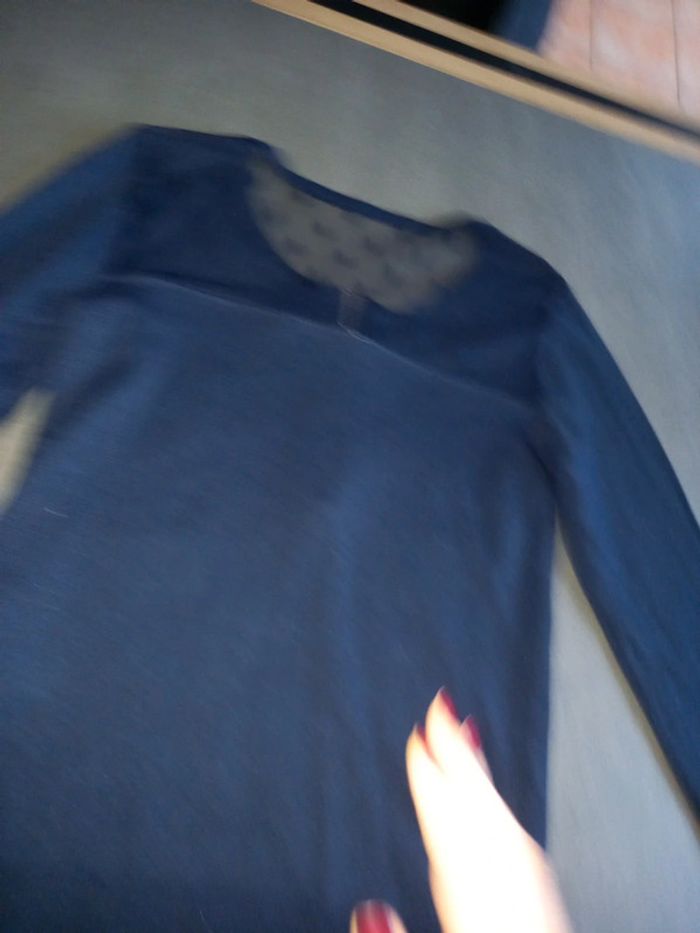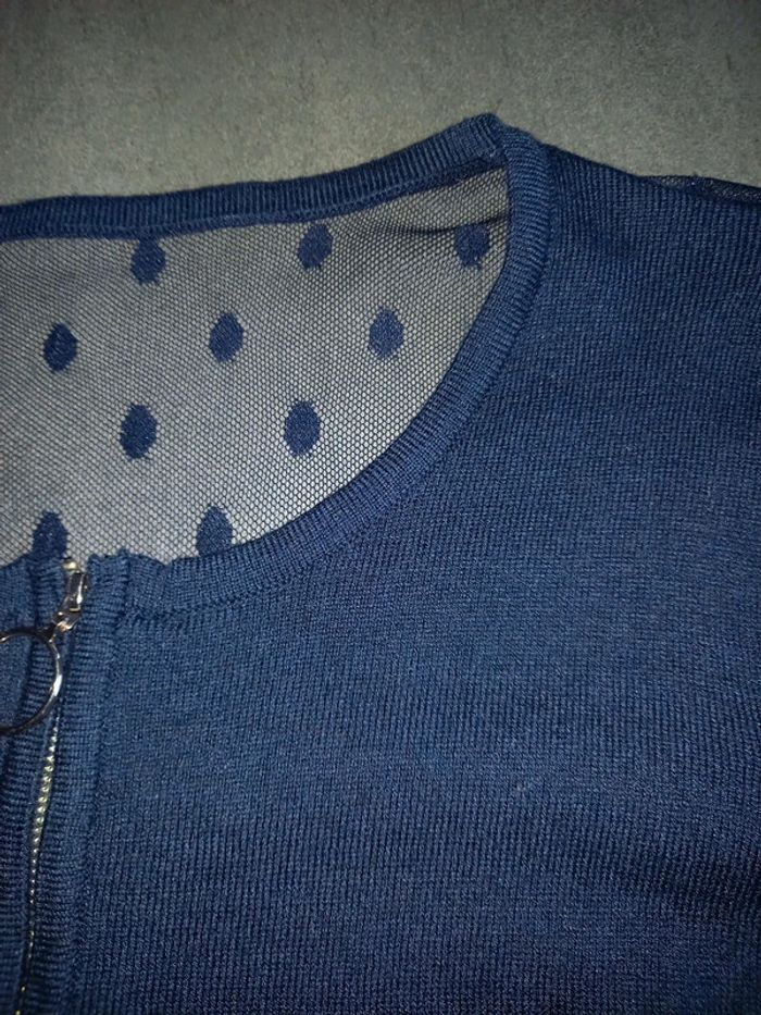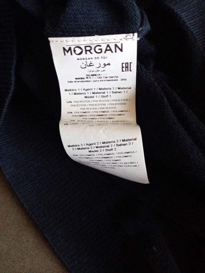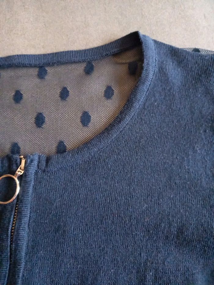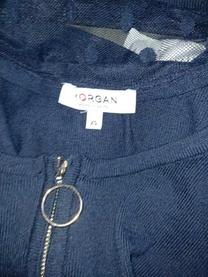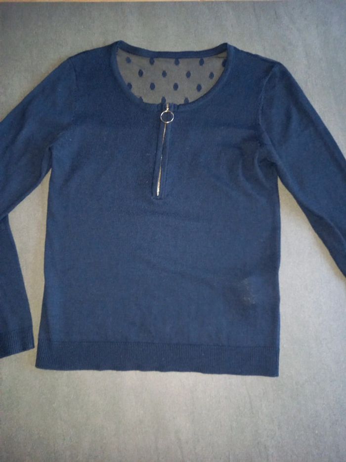 Pull Morgan comme neuf, état irréprochable car peu porté Marine Fermeture sur le devant qui peut être laissée ouverte pour 1 côté plus sexy Dentelle au dos Longueur 57 cms Largeur épaules 40 cms de couture à couture Longueur manches 57 cms Peut convenir à 1 taille 36 pour 1 effet plus ajusté Zéro défaut pas de bouloches ni traces d'usure