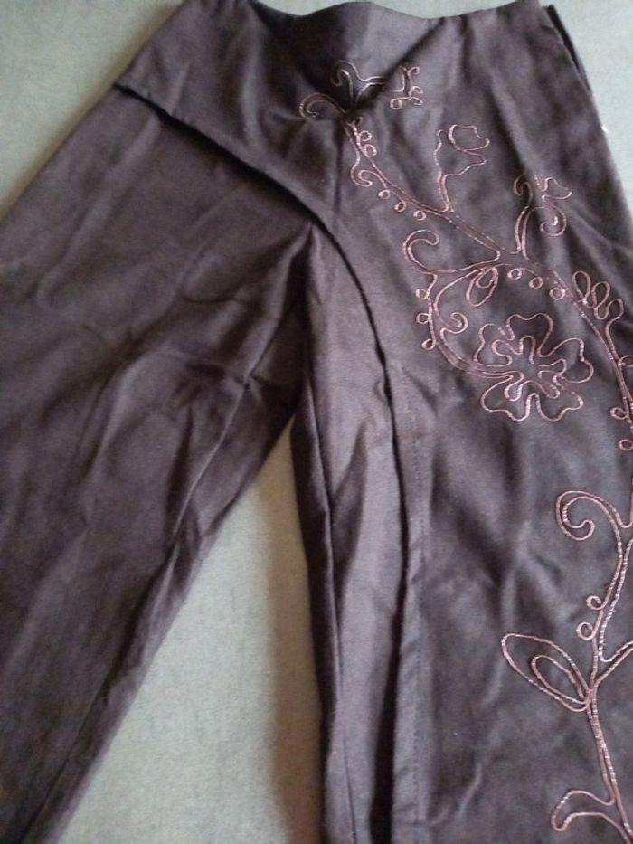 Pantalon chocolat laine et broderies