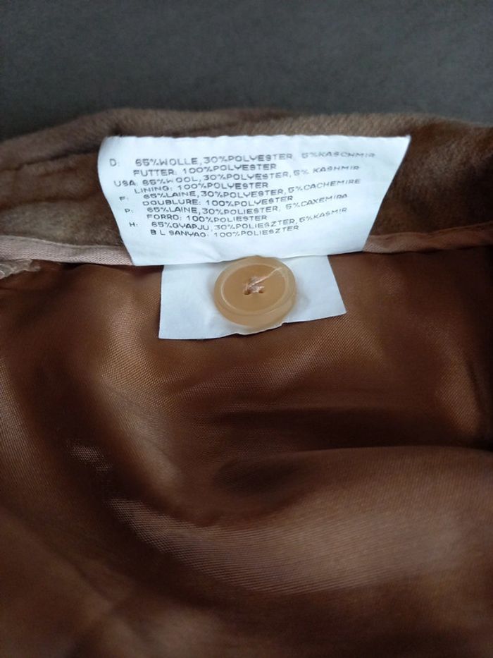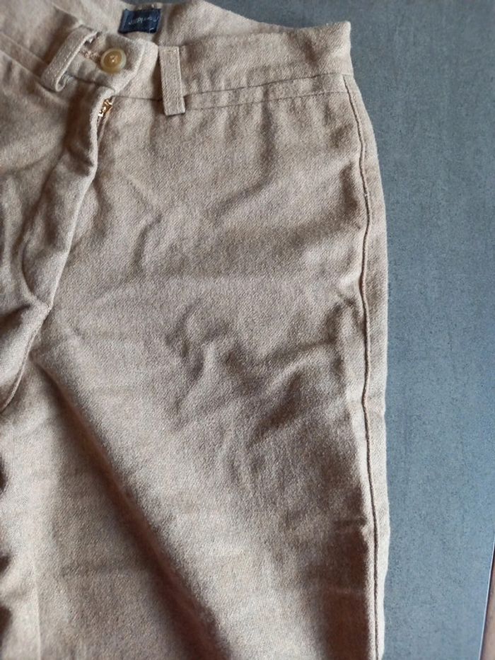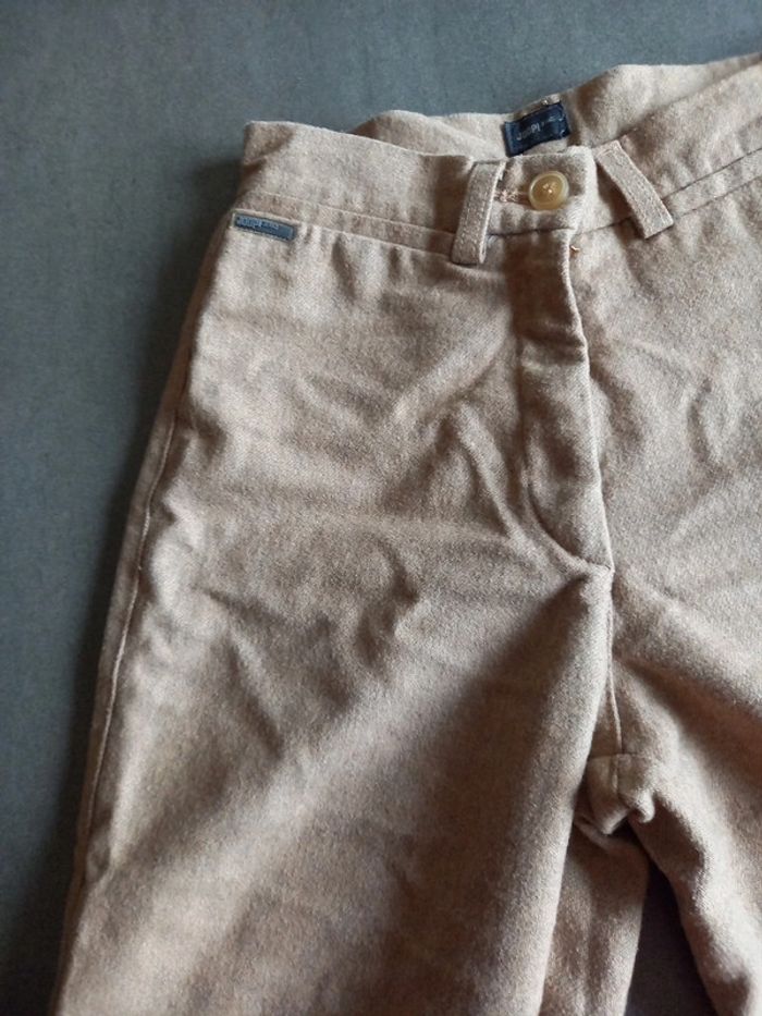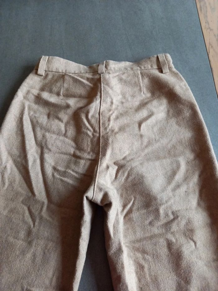 Pantalon confortable et chaud, il est doublé sur le devant jusqu au genoux 65 % laine 30 %polyester 5 % kaschmir Doublure 100 % polyester Largeur taille 31 cms Longueur 98 cms Couppe classique, droite bien ajusté pour une taille 34 Peu porté pas de défaut, bouton de secours encore présent sur l'étiquette