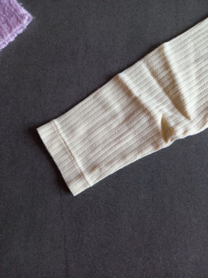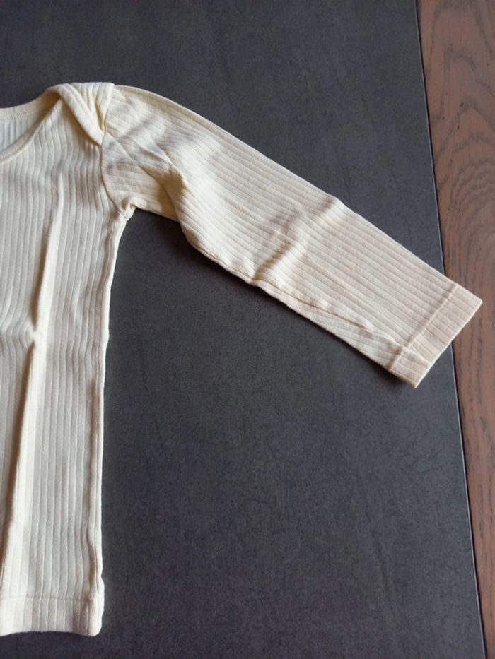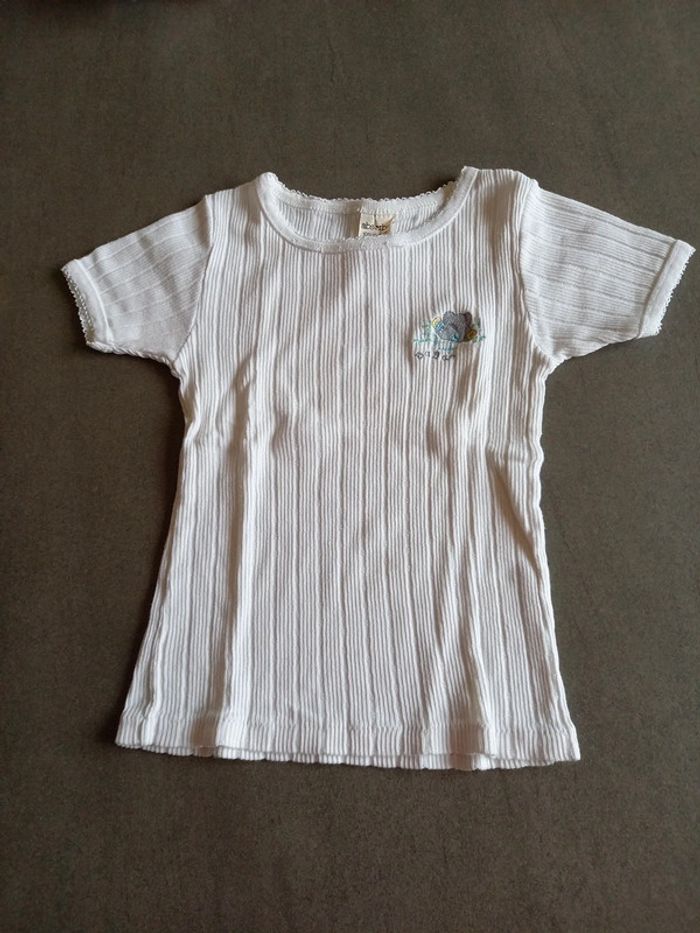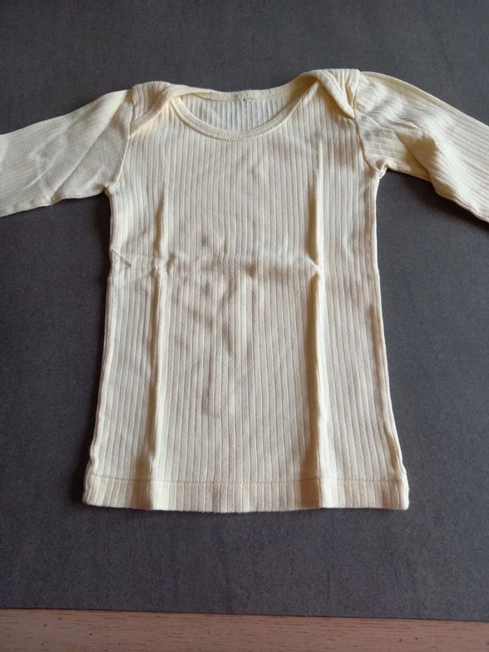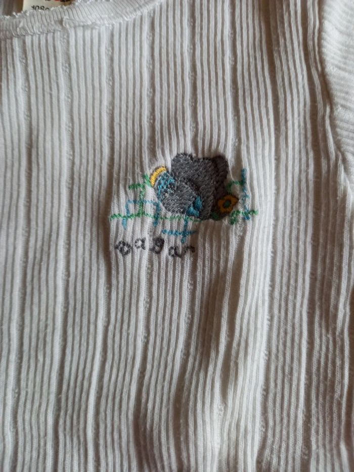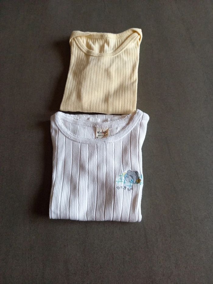 1 blanche motif Babar manche courte 1 jaune pâle manches longues , l'étiquette à été coupée, couture 1 peu décousue voir photo