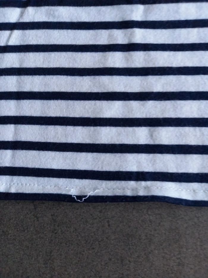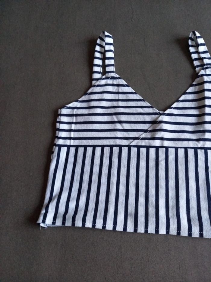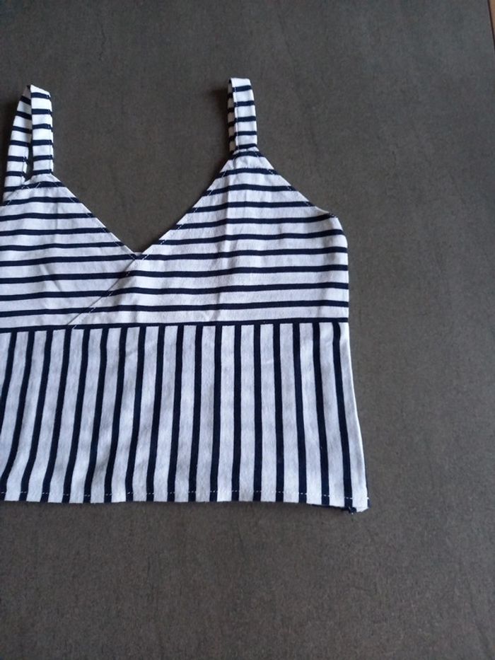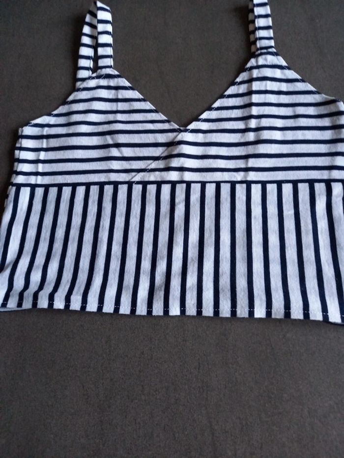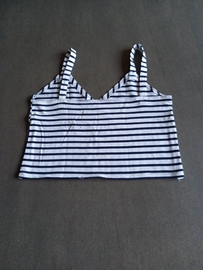 Top court taille XXS L'étiquette à été retirée Hauteur avec bretelles 34 cms Largeur poitrine 33 cms Décolleté en V Léger défaut 1 fil tiré sur la couture de l'ourlet en bas au dos voir dernière photo prise en gros plan