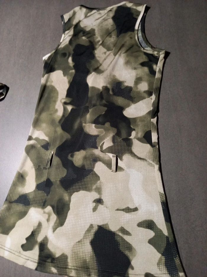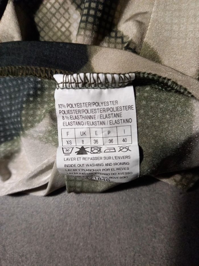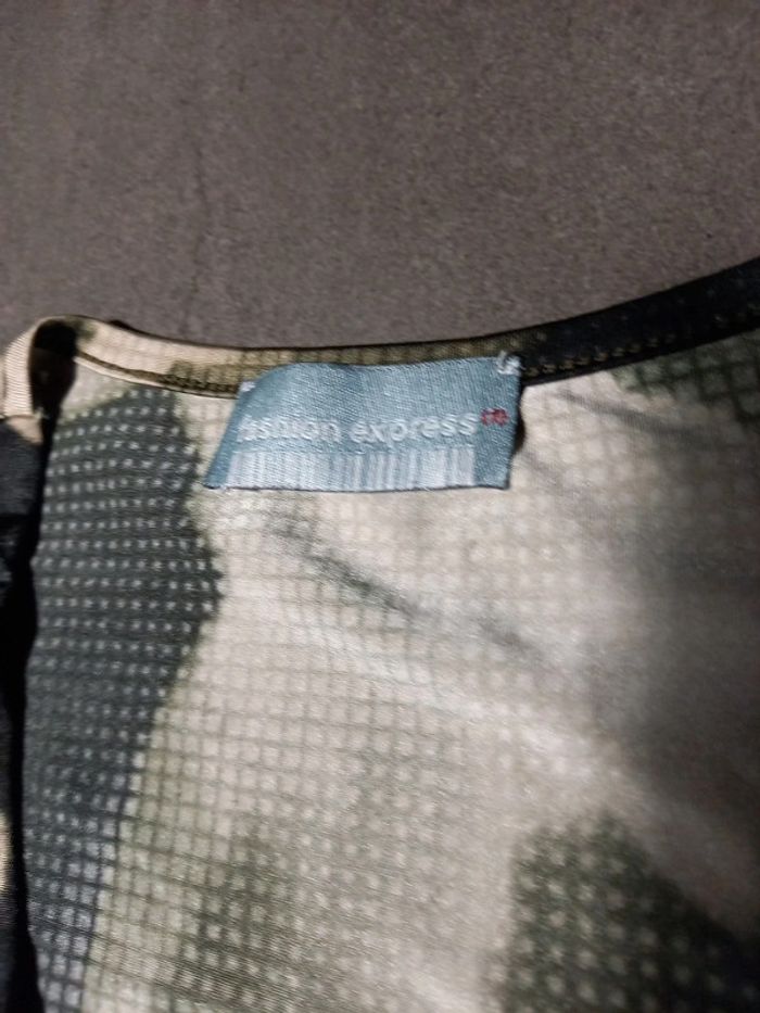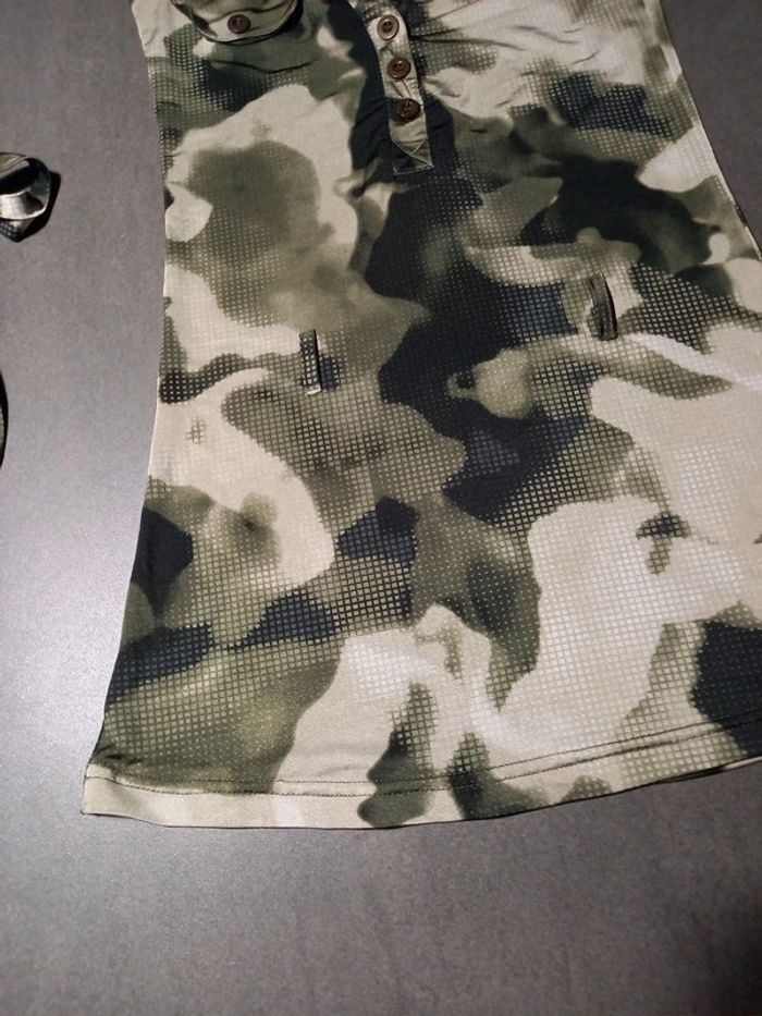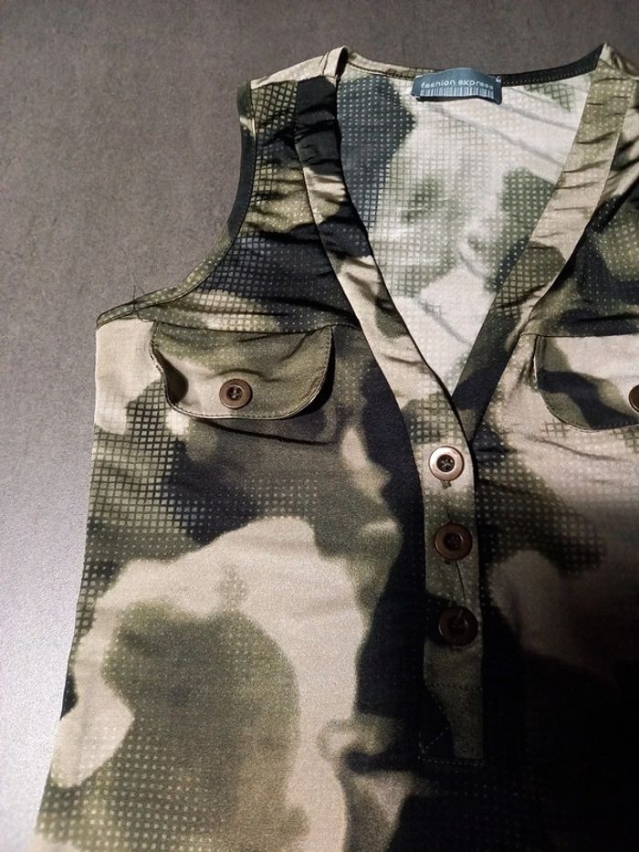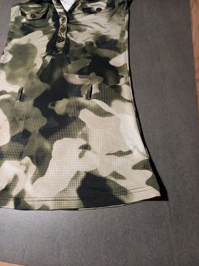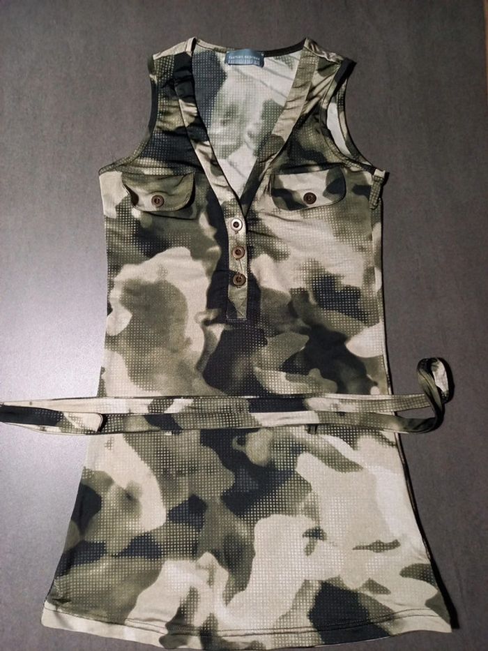 En parfait état pas de défauts Longueur 70 cms Largeur poitrine 33 cms Ceinture en tissu à nouer Très joli décolleté en V assez plongeant, 2 fausses poches poitrine Tissus très agréable à porter ne se froisse pas , repassage superflus. 92 % polyester 8 % élastane Couleurs noir, kaki et beige comme sur les photos