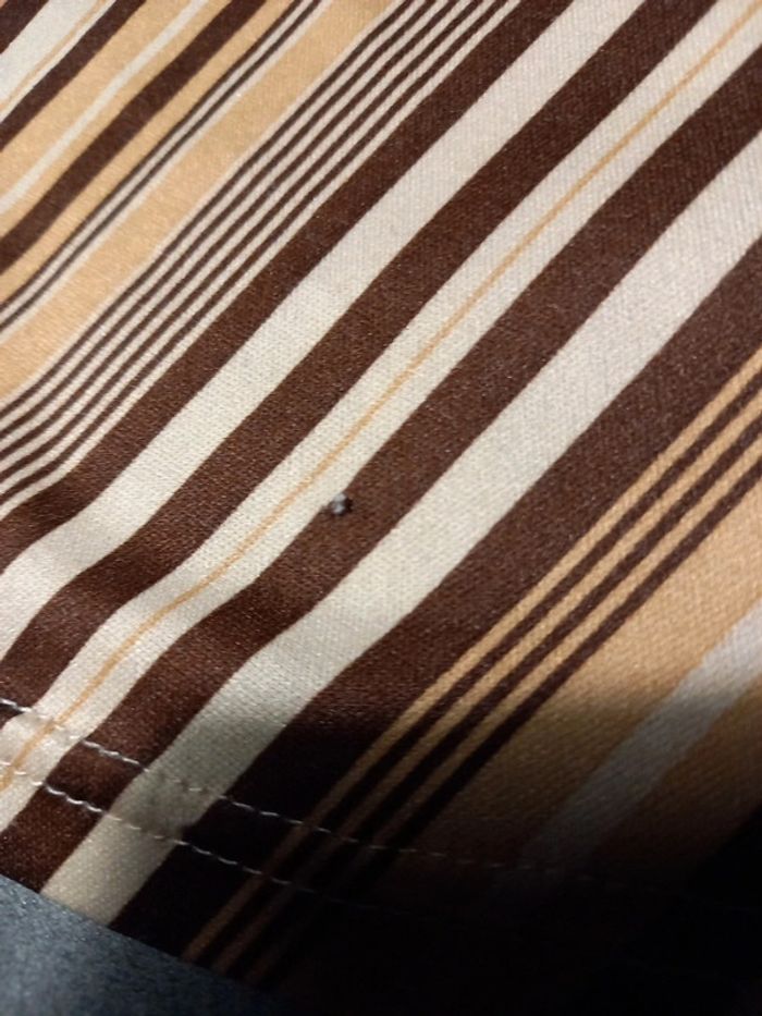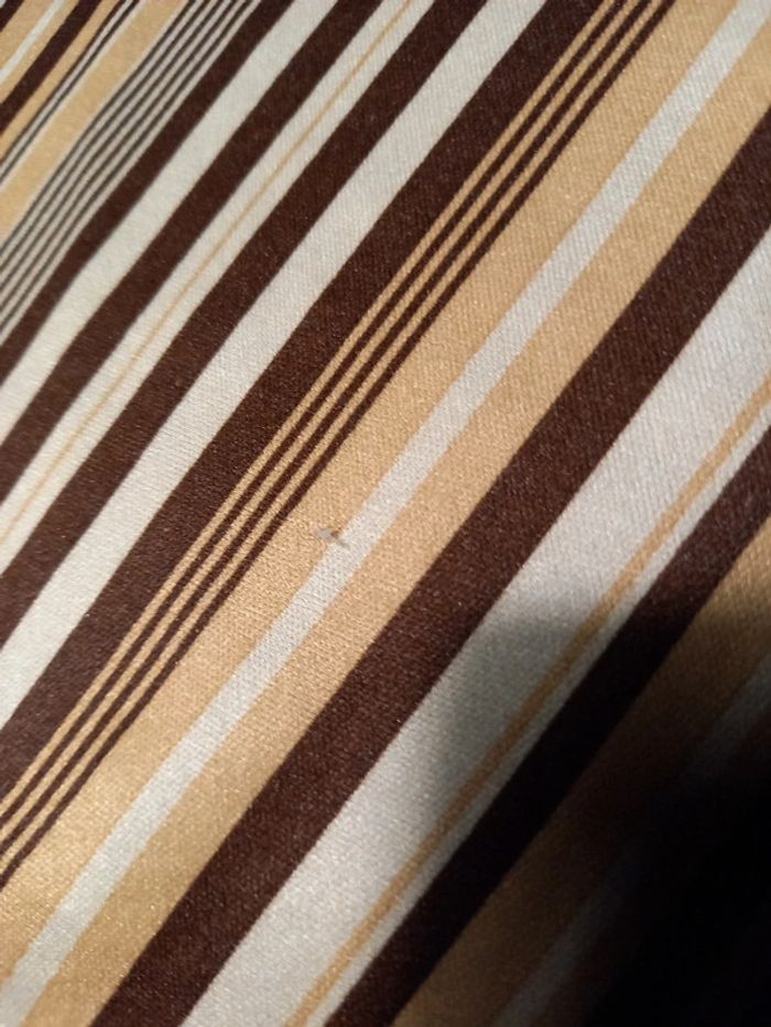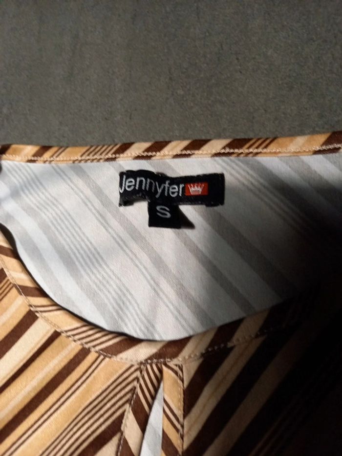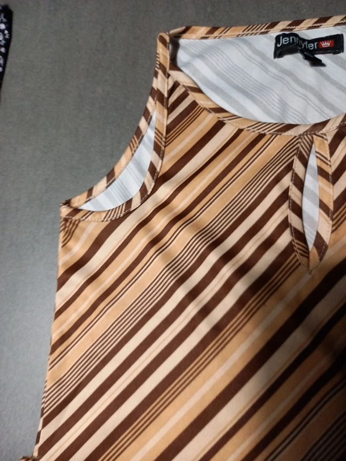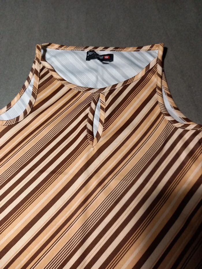 Top Jennyfer, joli décolleté avec goûté d eau au niveau de la poitrine. Fines rayures marron , crème et beige clair . En très bon état sauf 2 petits fils de tirés, voir les 2 dernières photo ou j'ai pris les petits défauts en gros plan, se voit à peine porté