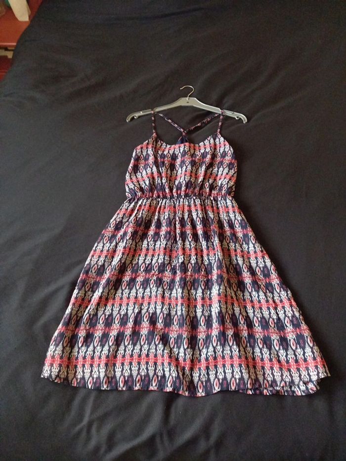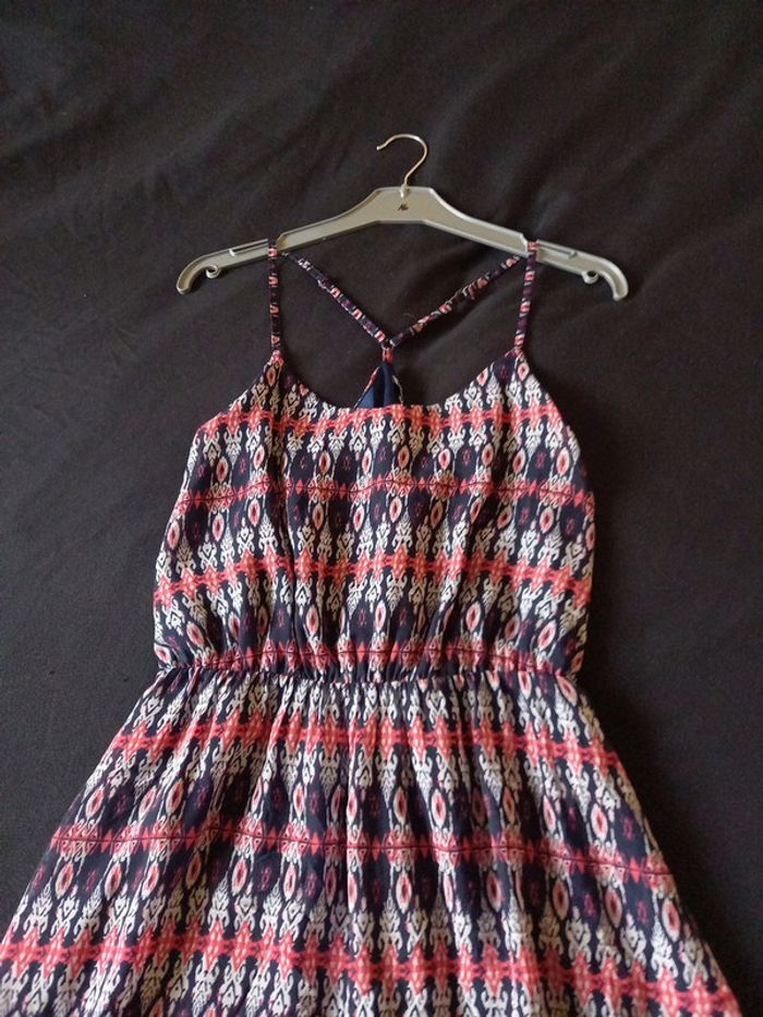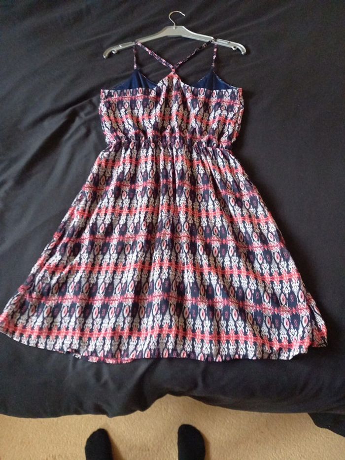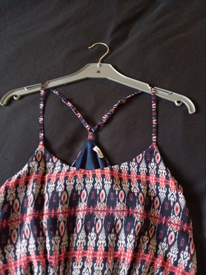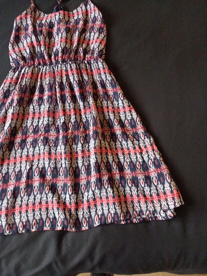 Robe très peu portée en parfait état Fines bretelles croisées dans le dos épaules dégagées. Taille elastiquée Entièrement doublée Jolie matière qui ne se froisse pas, l'étiquette de la composition à été coupée. Motifs géométriques, couleur marine, beige et orangé.