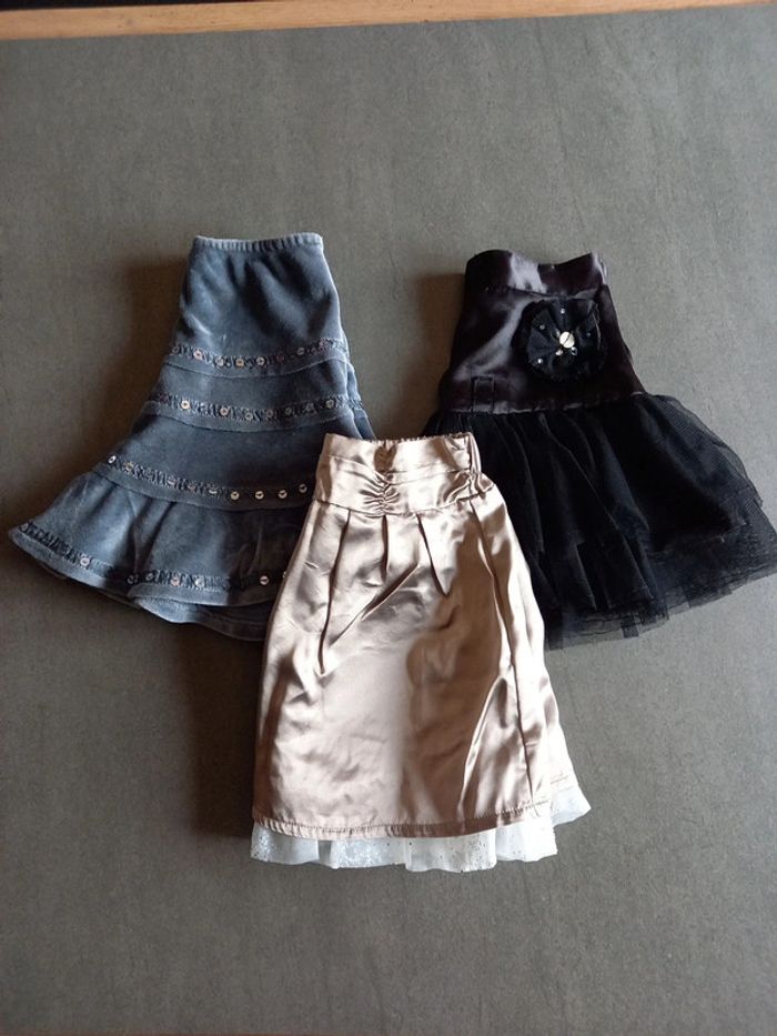 Lot de 3 jupes en 3 ans 1 grise en velours rasé avec petites perles strass taille elastiquée de la marque Sergent Major. 1 noire matière satinée et tulle de la marque Kiabi taille réglable avec Élastiques et bouton à l'intérieur et fermeture éclair sur le côté 1 beige dorée matière satinée avec volant tulle blanc cassé et perles strass en bas , taille elastiquée de la marque Kidkanai. Les 3 jupes ont été peu portées et sont en très bon état