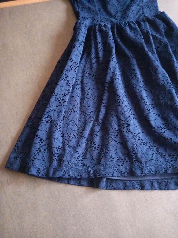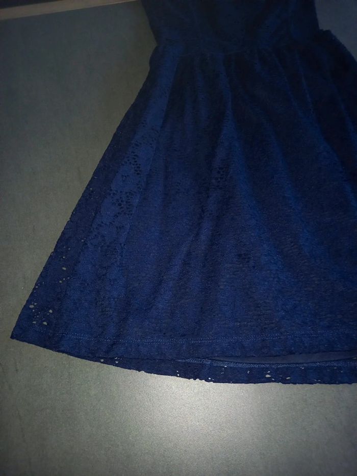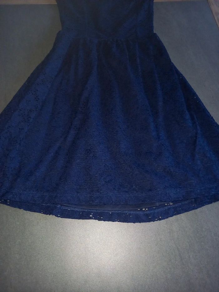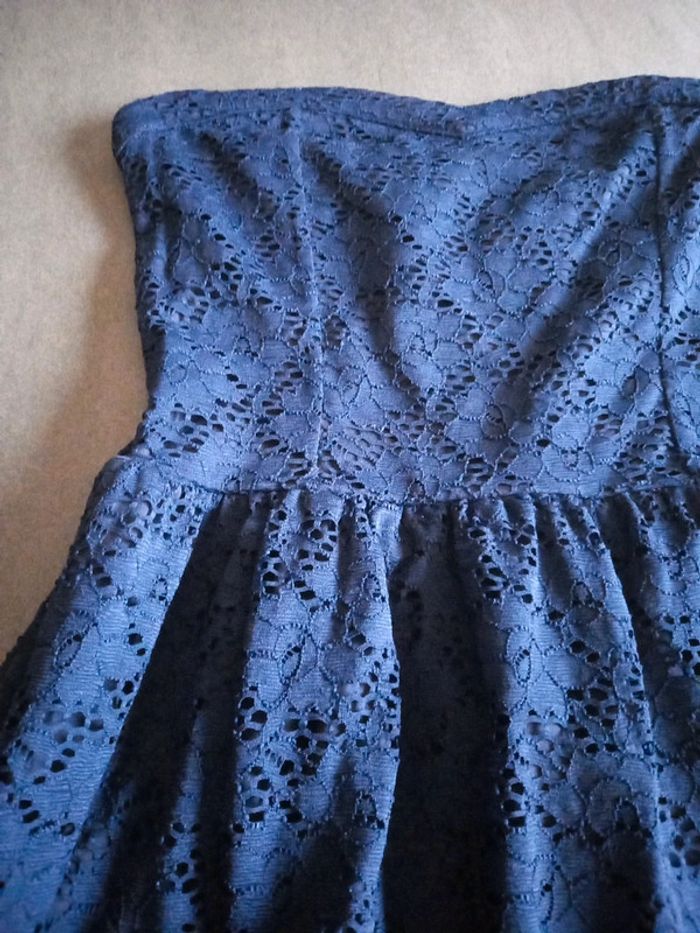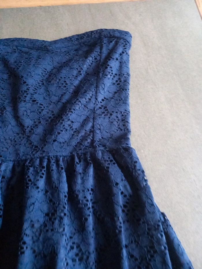Jolie robe bustier, dos smocké, légèrement resserré à la taille pour une belle mise en valeur de la silhouette En dentelle bleu marine Entièrement doublée Très peu portée Longueur 68 cms Matière polyester qui ne nécessite pas de repassage