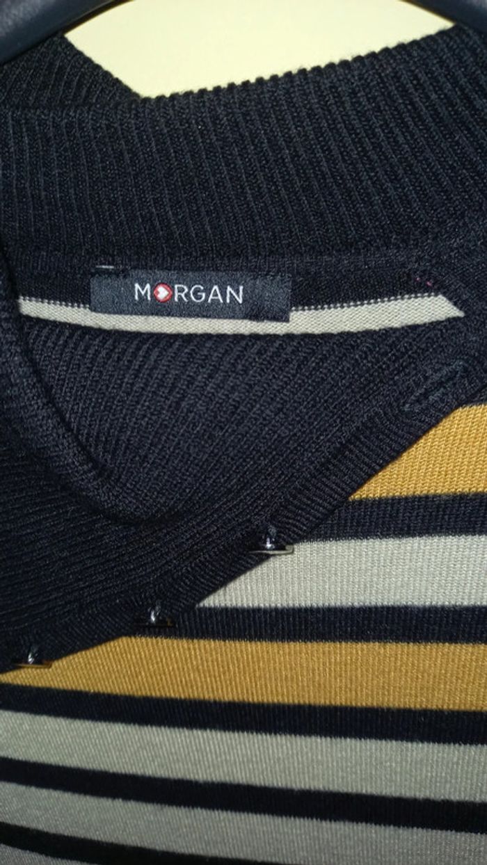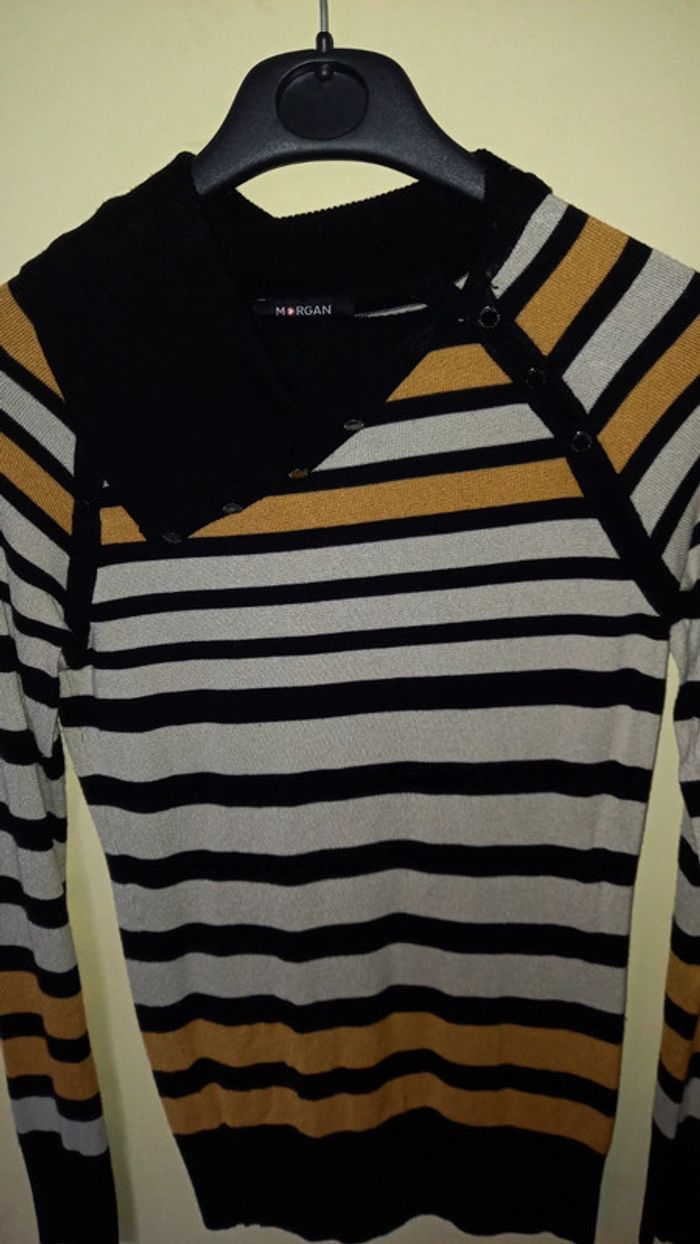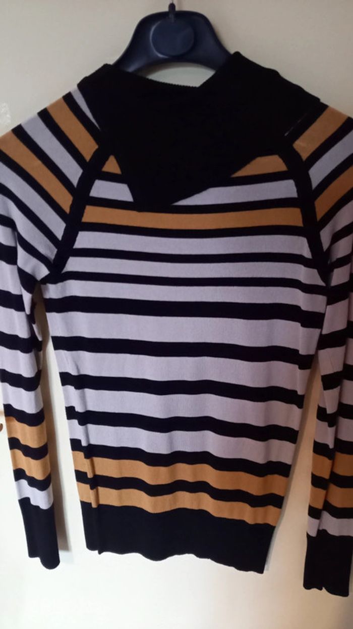A rayures noir, moutarde et gris clair Petits boutons sur le col Très peu porté