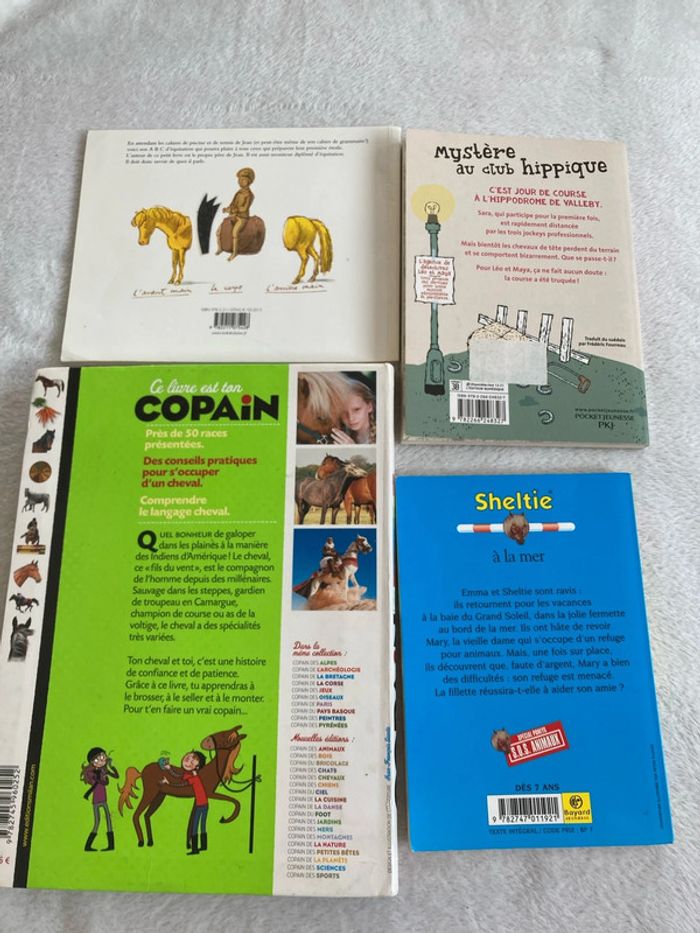 4 livres sur les chevaux Un gros livre : copain des chevaux Sheltie à la mer Nougatine Mystère au club hippique