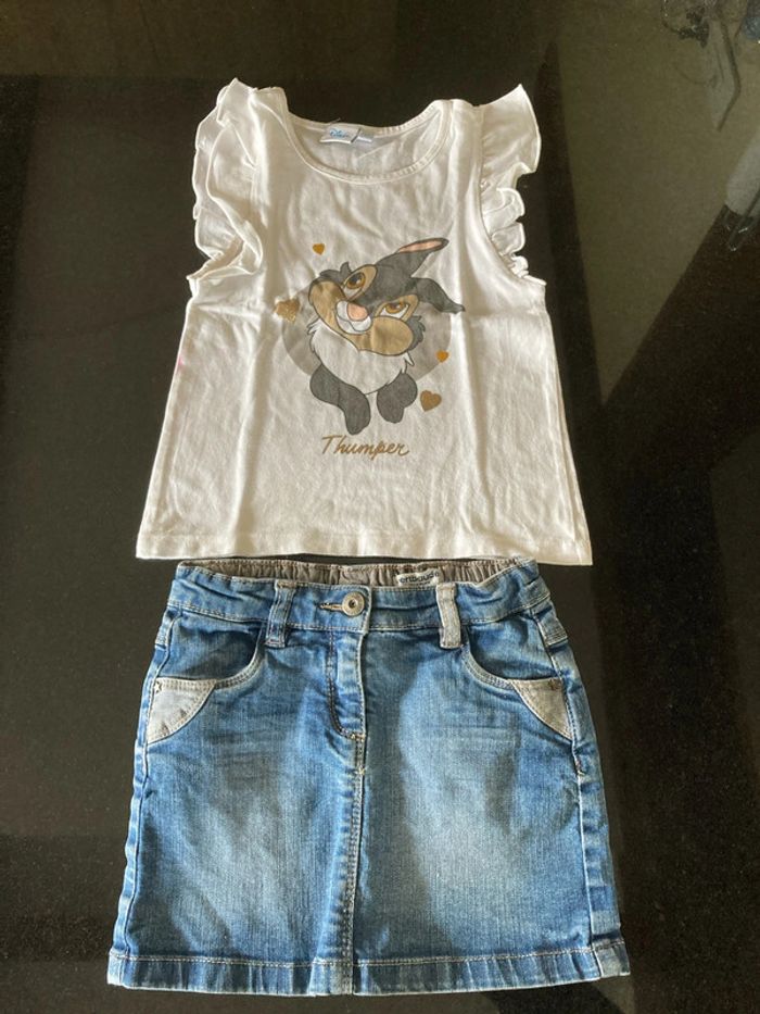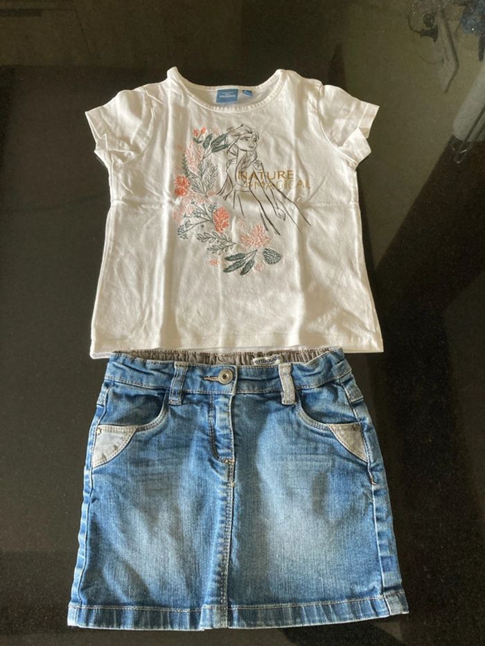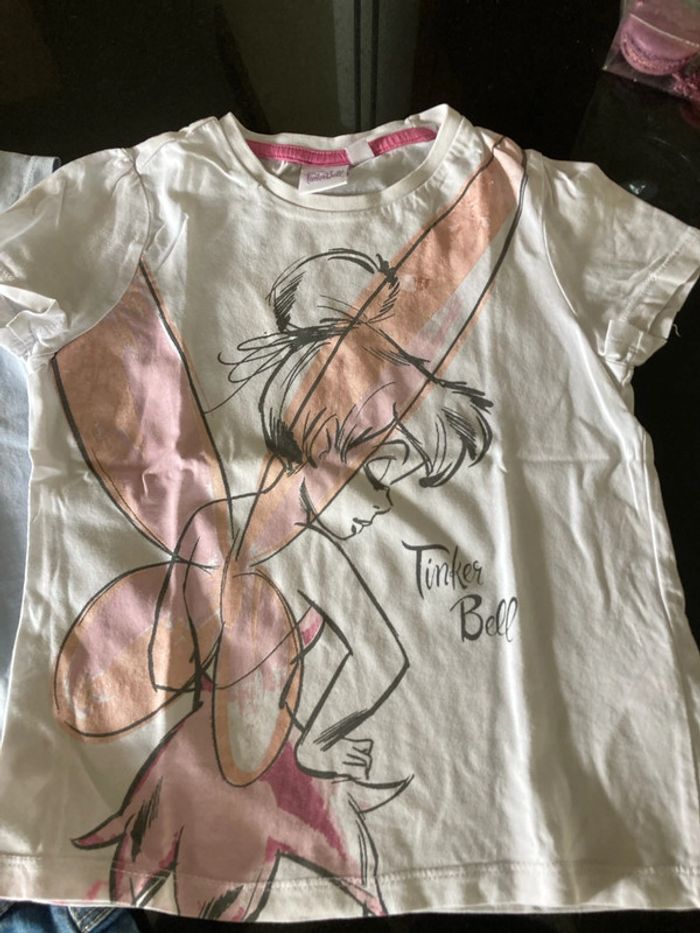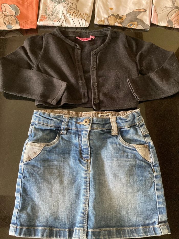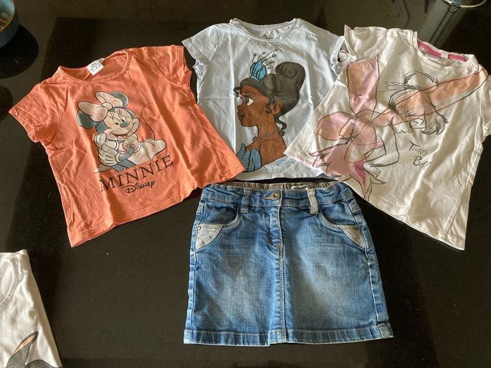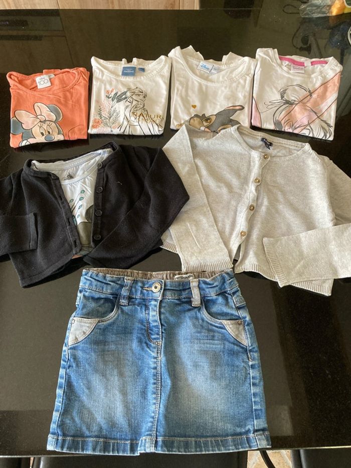 Une jupe en jean vertbaudet Deux gilets fin à boutons Cinq t shirts manches courtes Disney Deux taches sur pan pan Une tache sur fée clochette Le reste est en parfait état