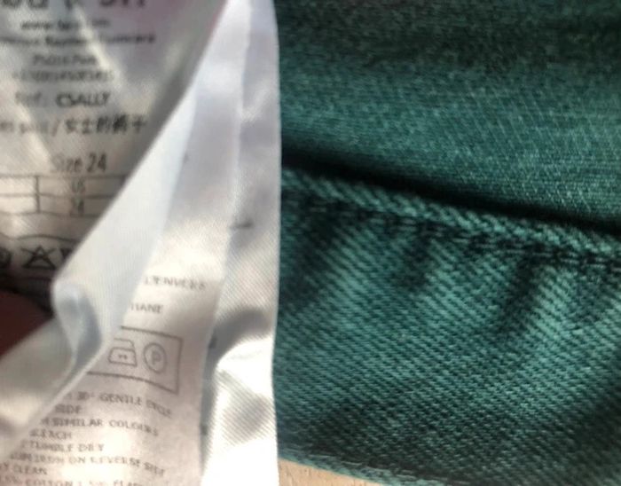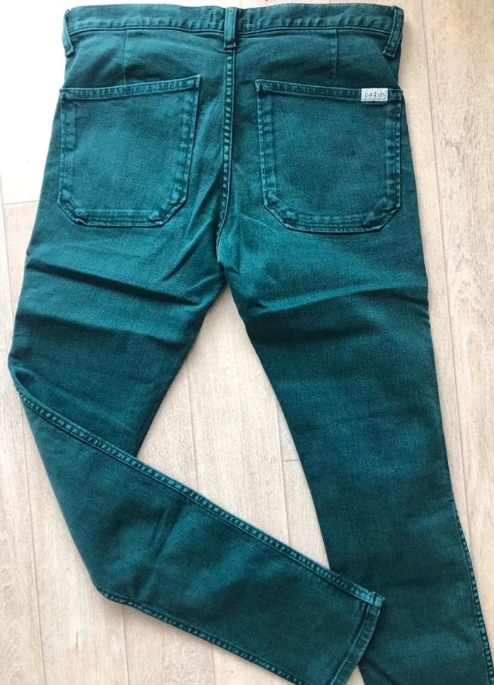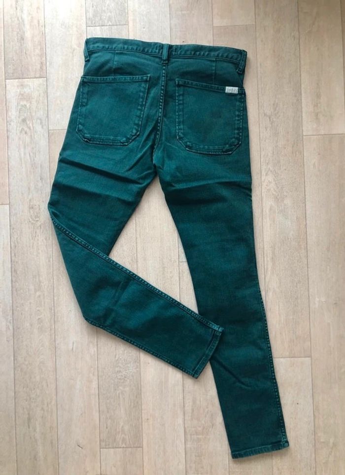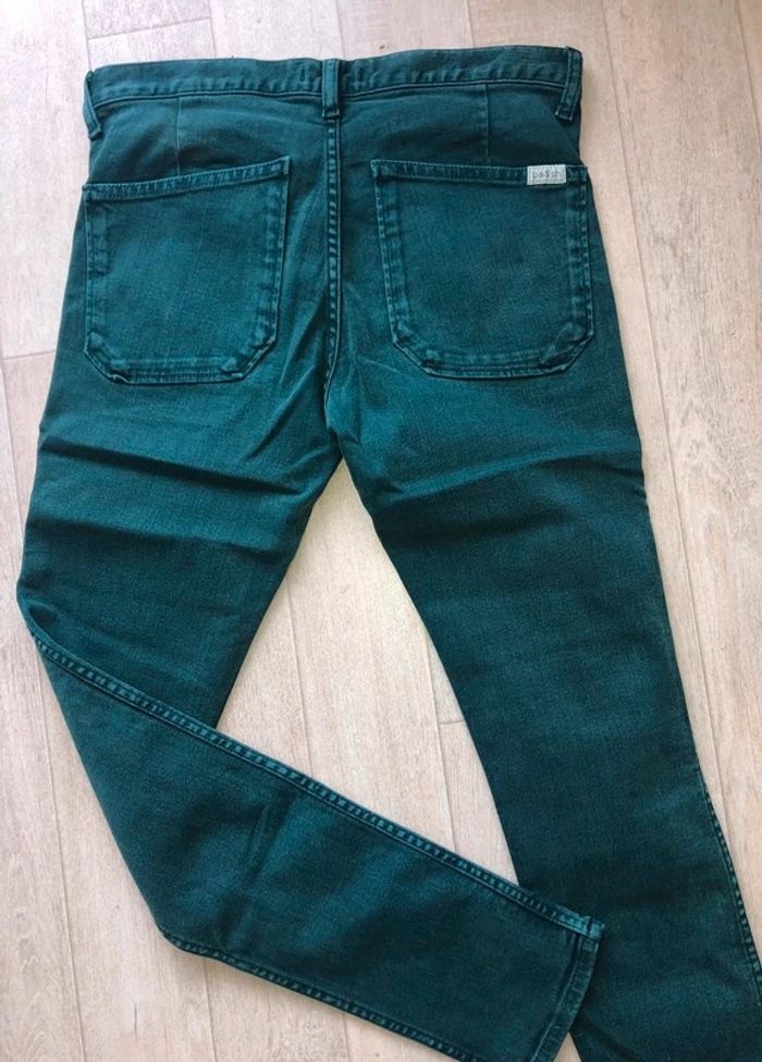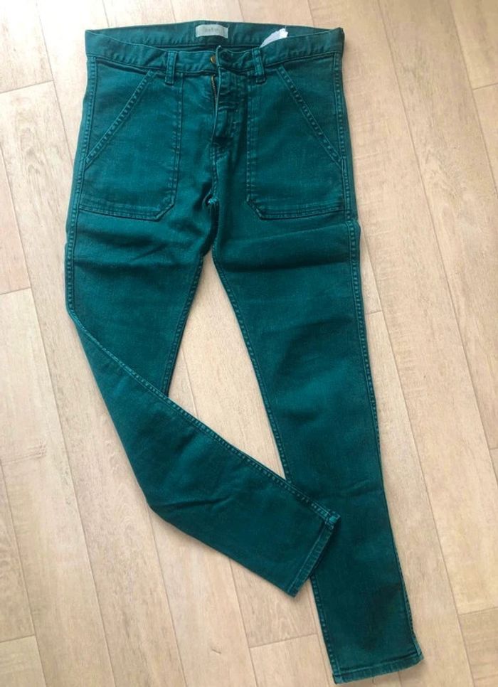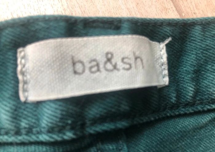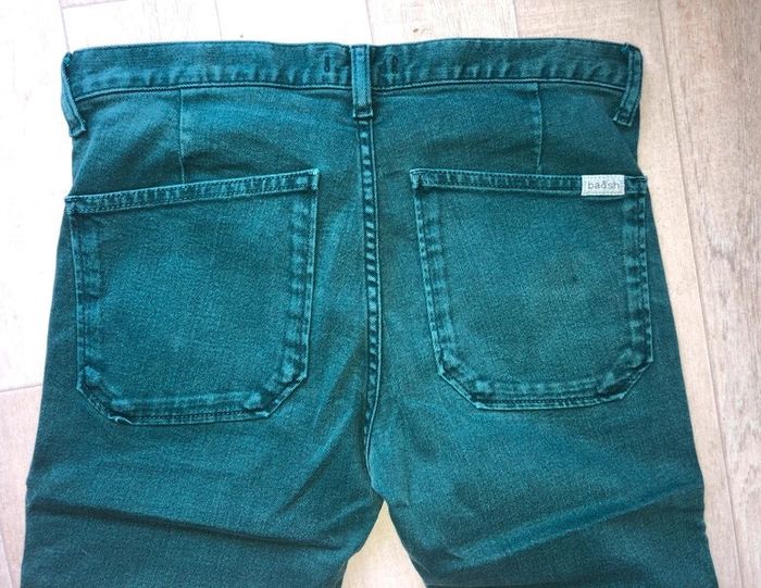 Pantalon vert en bon état. Taille 24 Jean slim d'occasion de chez Ba&sh green. Matière principale coton. Taille 24 (taille 64 cm et hanches 90cm) Collection Femme. Très bon état.