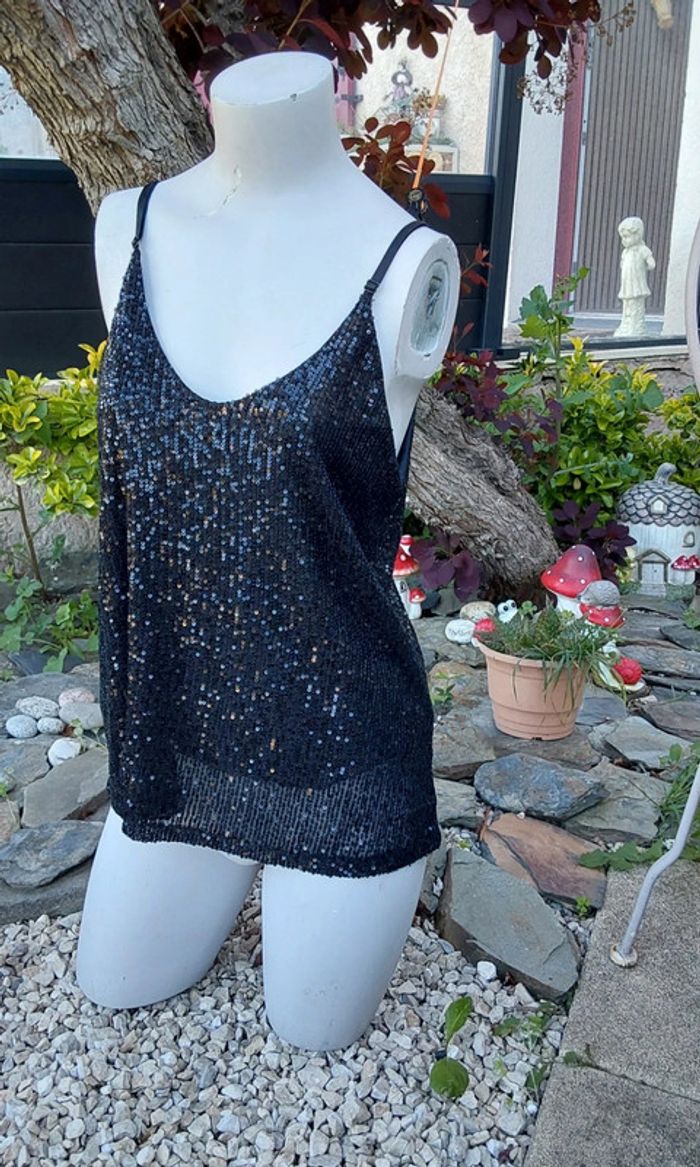 Joli haut débardeur top noir perlé T 40 - photo numéro 9