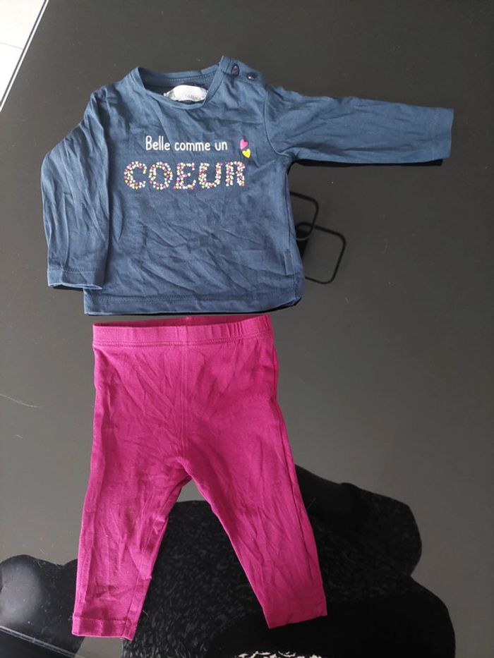 Lot Tee-shirt manches longues marque les petits cailloux taille 6 mois et legging marque mots d'enfant taille 6 mois. Les 2 en très bon état peu porté.