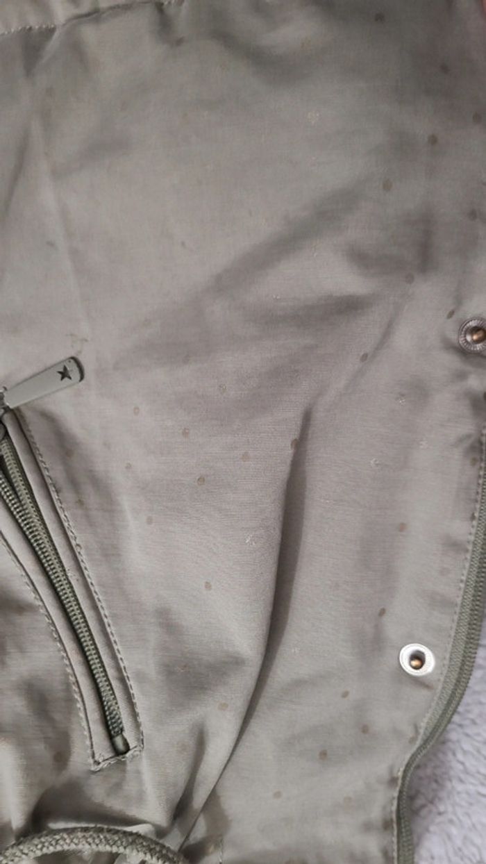 Porté mais reste en tres bon etat Tout doux a l''interieur Juste les petit point doré effacé a certains endroit Manque la fourrure pression sur la capuche