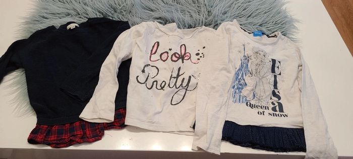 1 pull fin bleu marine avec effet chemise en bas verbaudet Un tee shirt mL gemo Un tee shirt reine des neiges abec volant en bas