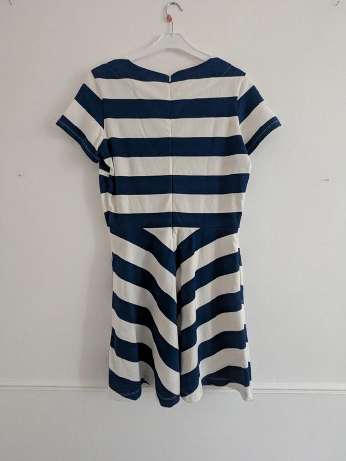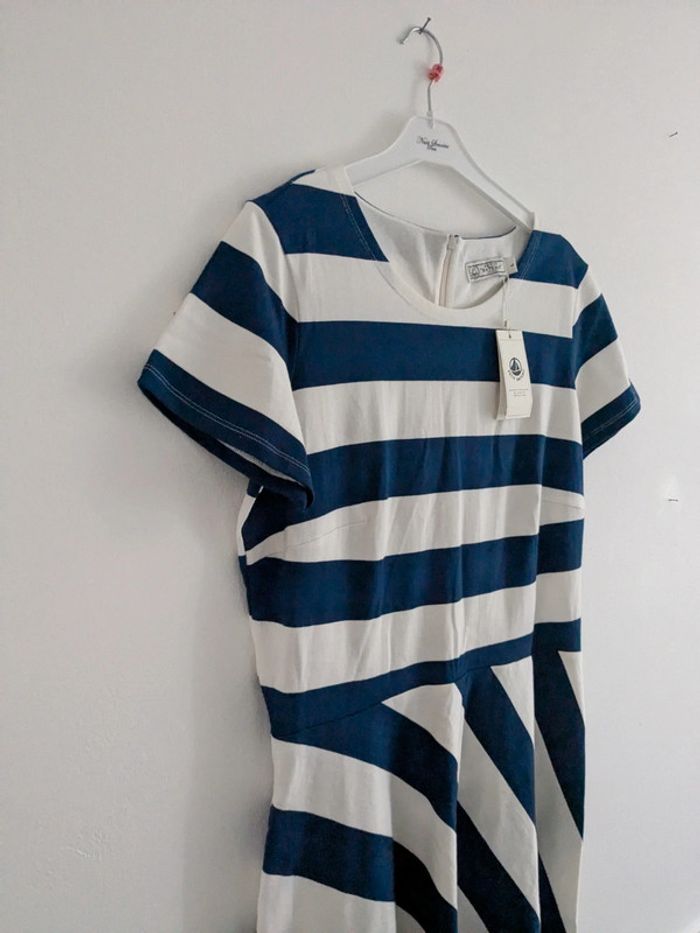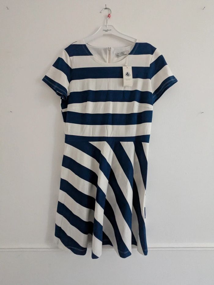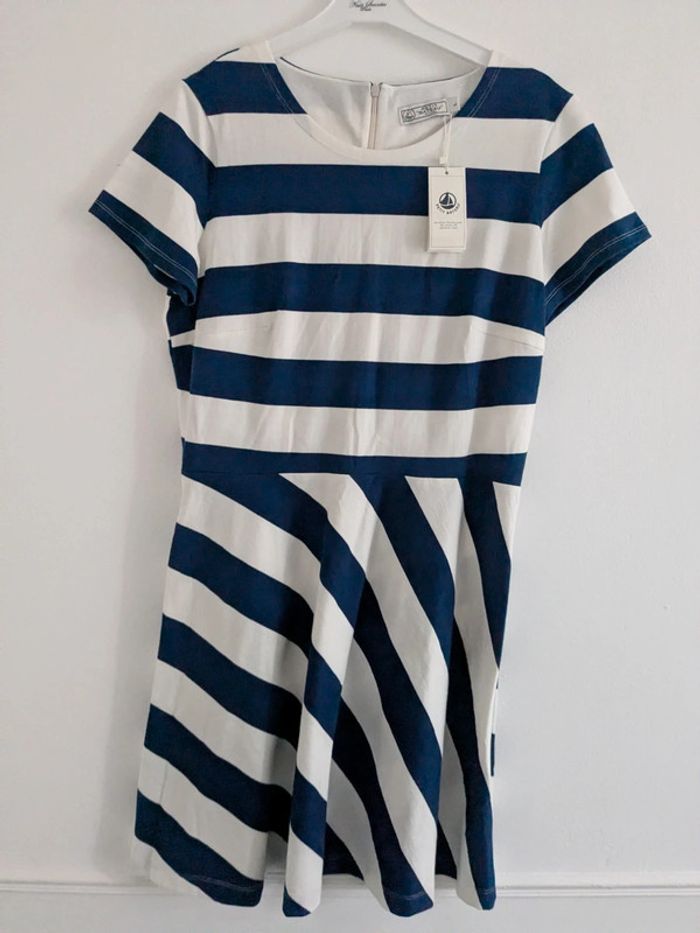 Valeur magasin 99€ Je dispose d'une Photo portée Me demander Robe rayée blanche et bleue M petit bateau Robe manches courtes, coupée à la taille pour un volume très féminin avec sa jupe patineuse. En jersey de coton rayure égale. Col rond Graphique et féminine grâce à son jeu de rayures, et sa taille coupée.