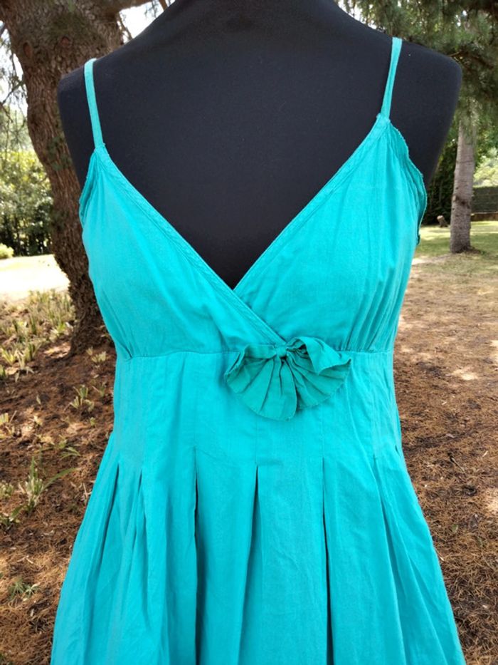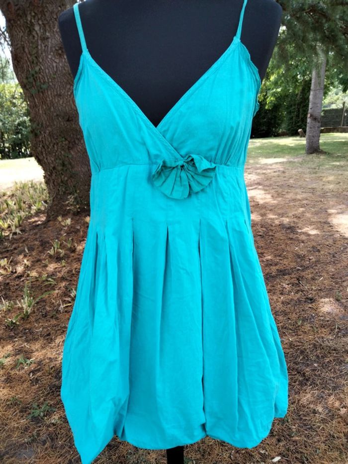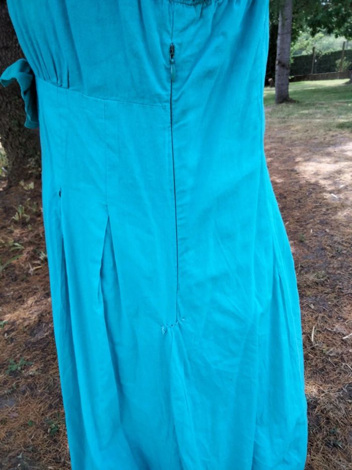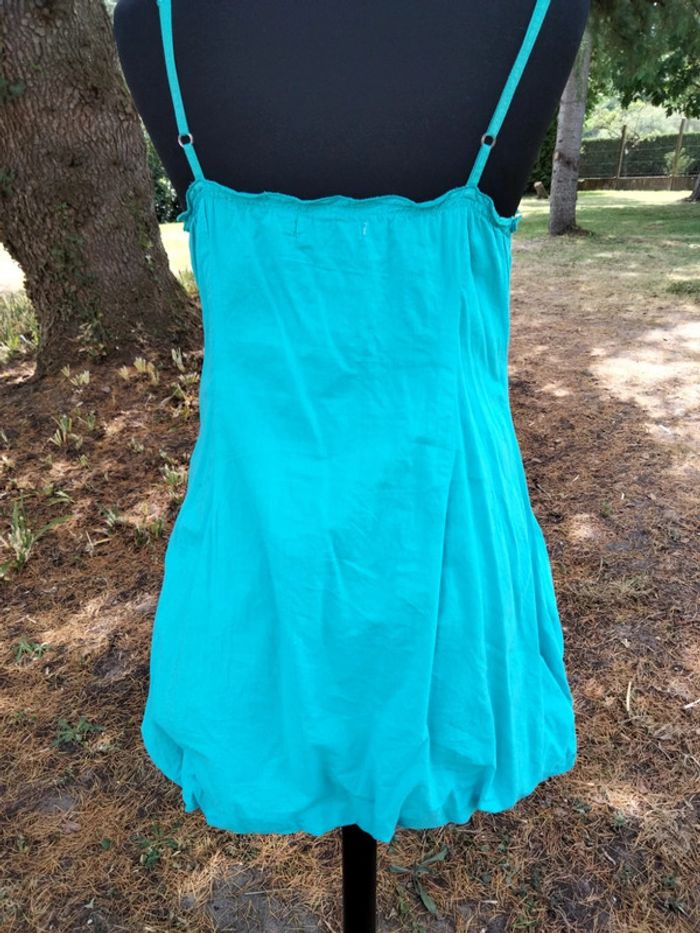 Jolie tunique Cache Cache bleu turquoise. Pâtit défaut sur le côté en bas de la fermeture, voir photo. Mais reste en bon état général Peut se porter seule ou avec un legging. Taille 2