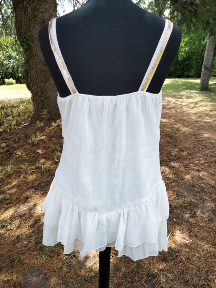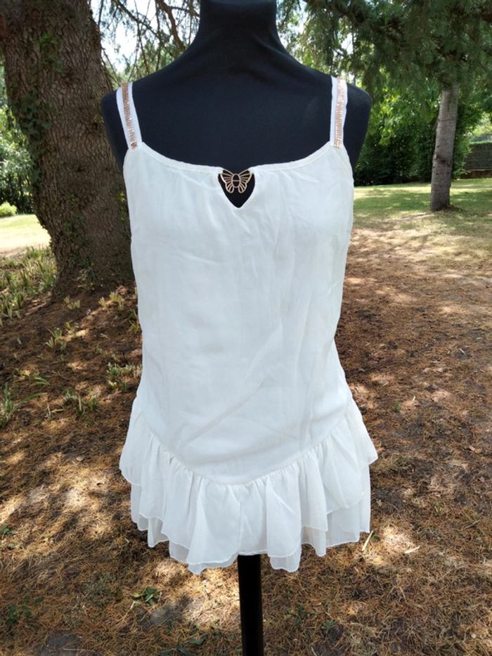 Tunique blanche avec reflets dorés de marque Cache Cache. Avec doublure Très bon état Taille 2
