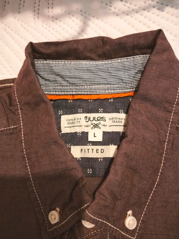Chemise homme Jules en très bon état, juste un petit défaut léger devant (cf photos) qui ne se voit pas quand la chemise est boutonnée. Taille L