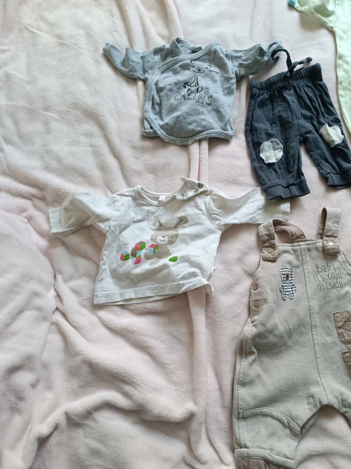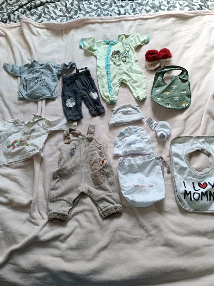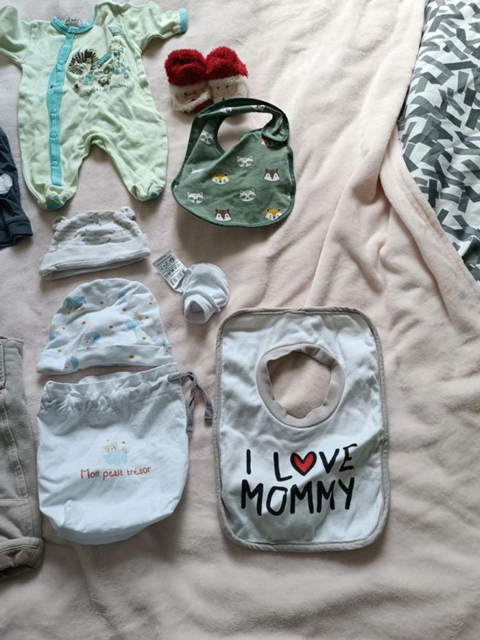 Petit lot de naissance a 1 mois 1 haut 1 body 1 pantalon Une combinaison 1 pyjamas 2 bavoir 1 paire de chaussons 2 bonnet plus petit sac 1 paire de mouffle