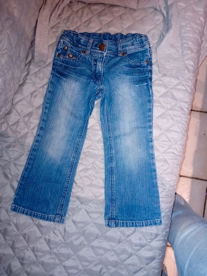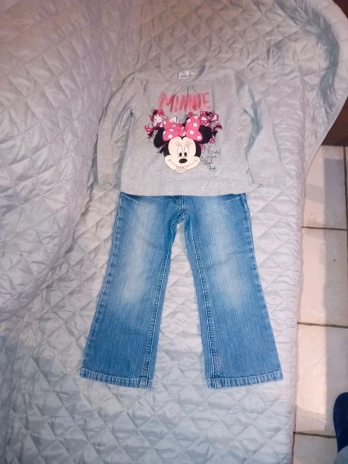 Tee-shirt à manches longues taille 3ans Bon etat , il y a juste une trace craquelé sur le tete de minnie ( voir photo) Jeans taille 3ans réglable à la taille Bon etat #faufautine2021vetementfille3ans