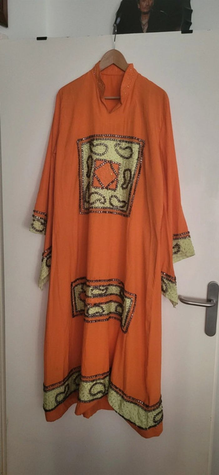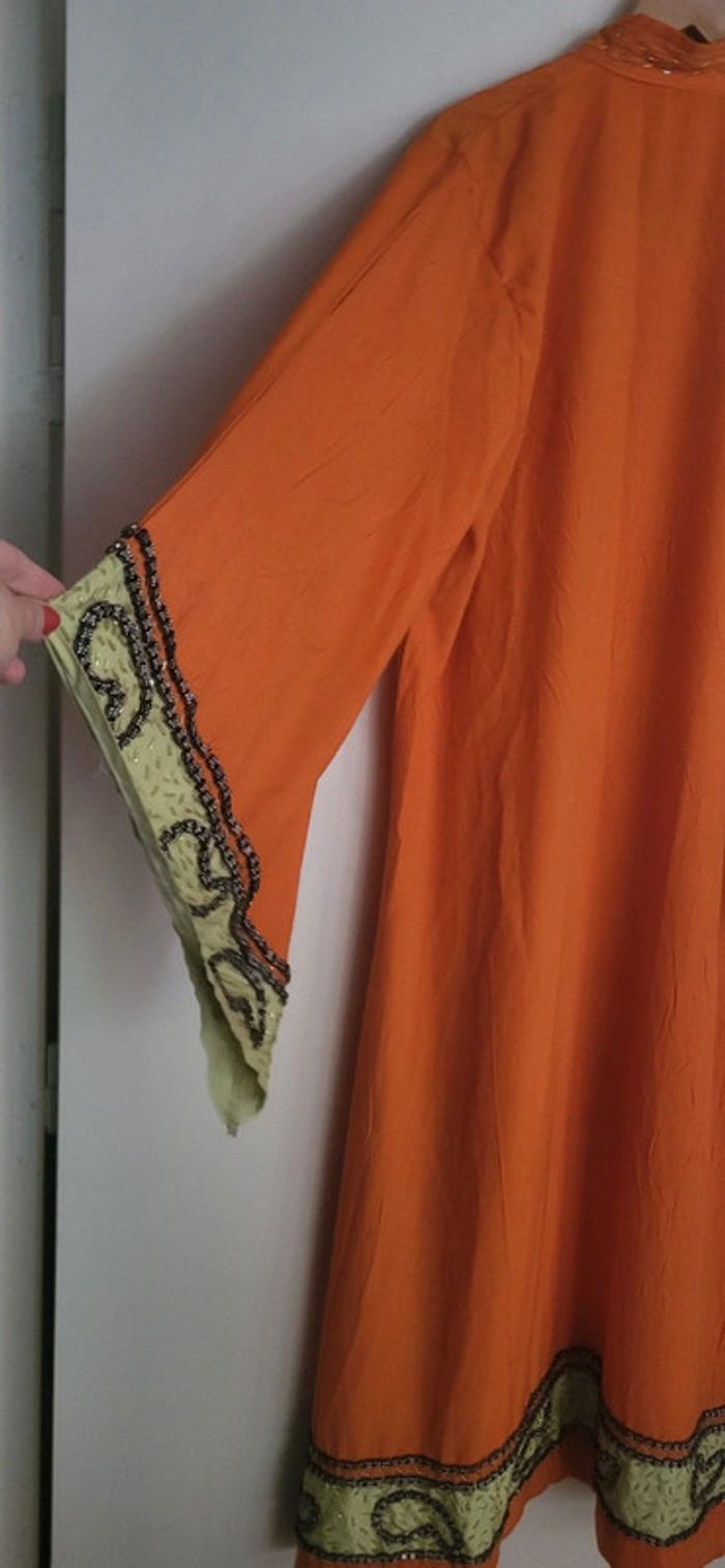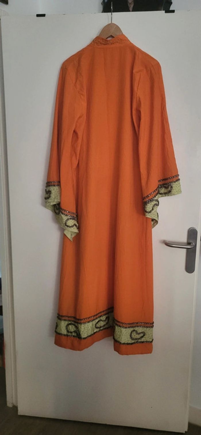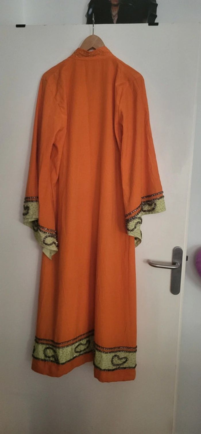 Magnifique robe oriental orange avec des détails en perles. Taille 44. En très bon état. Mensuration à plat : Epaule à epaule : 45cm Aisselle à Aisselle : 58cm Taille à plat : 58cm Longeur total : 138cm #echelon1844