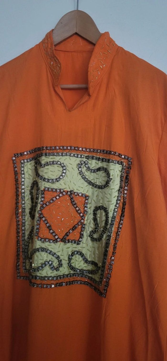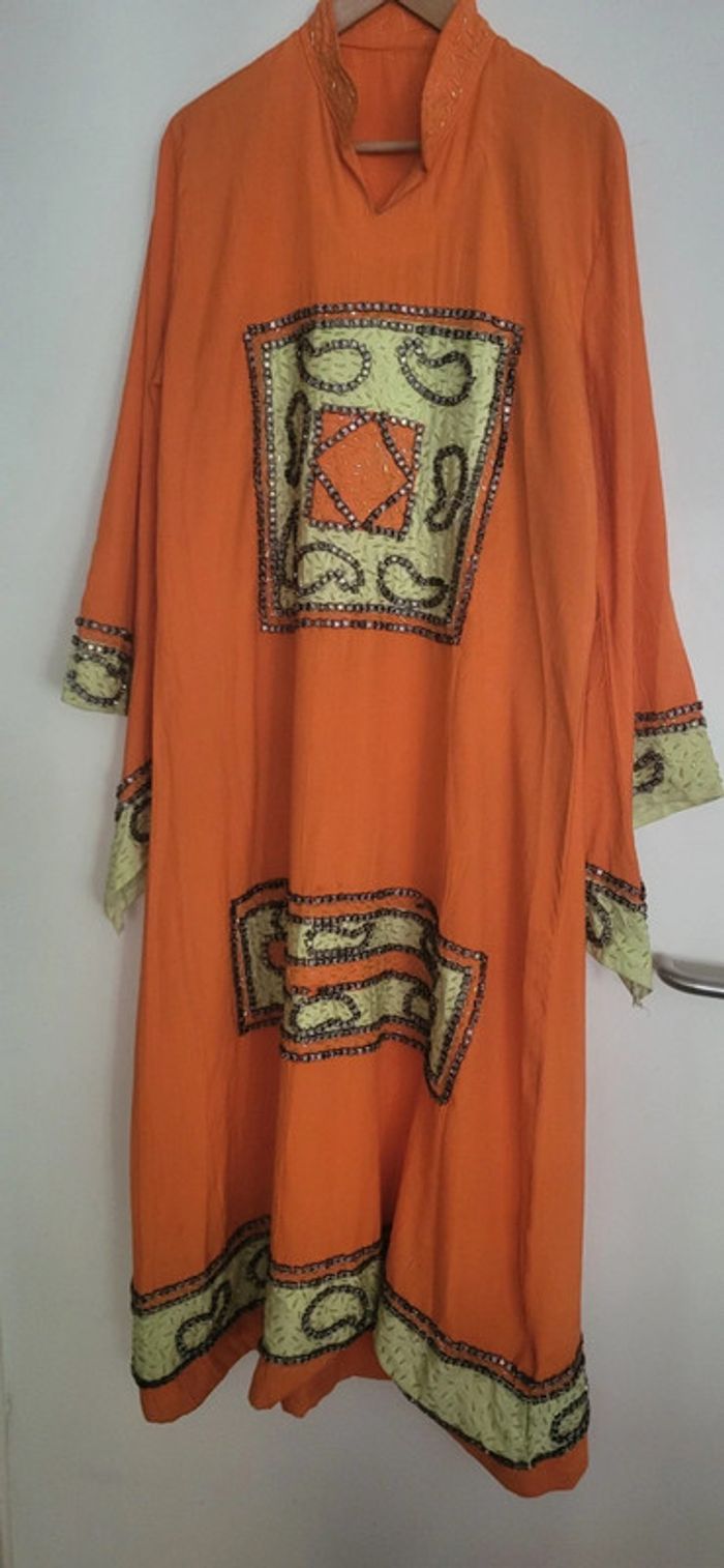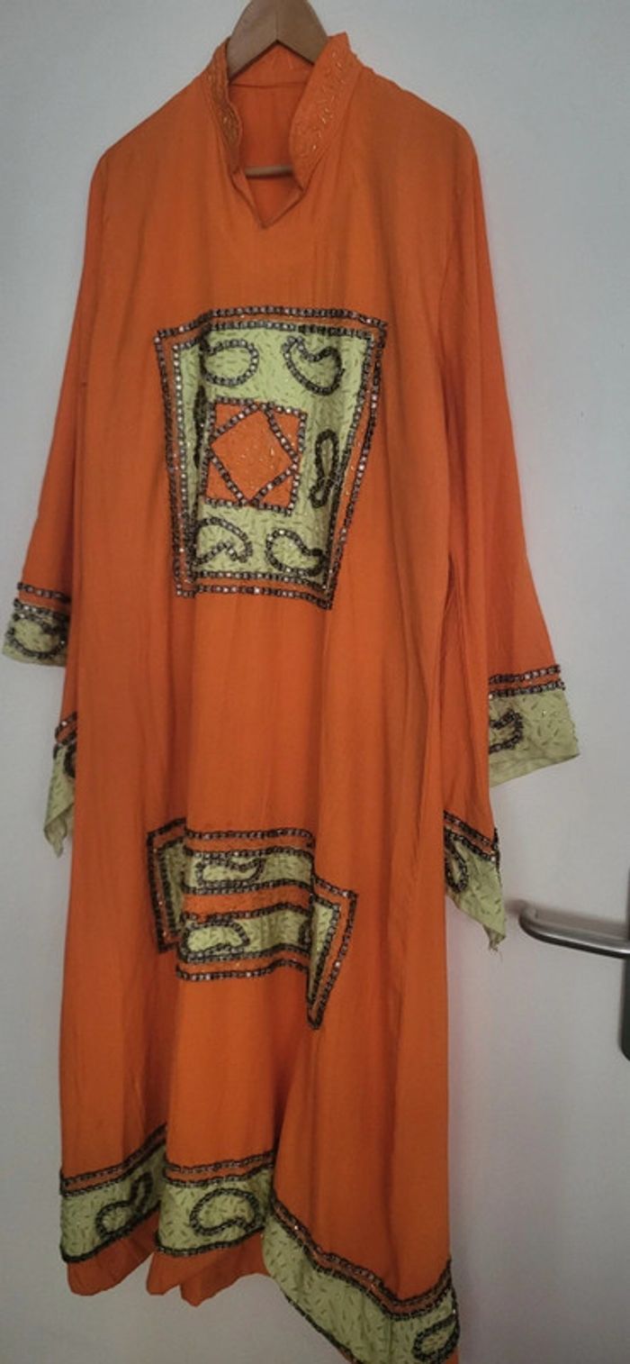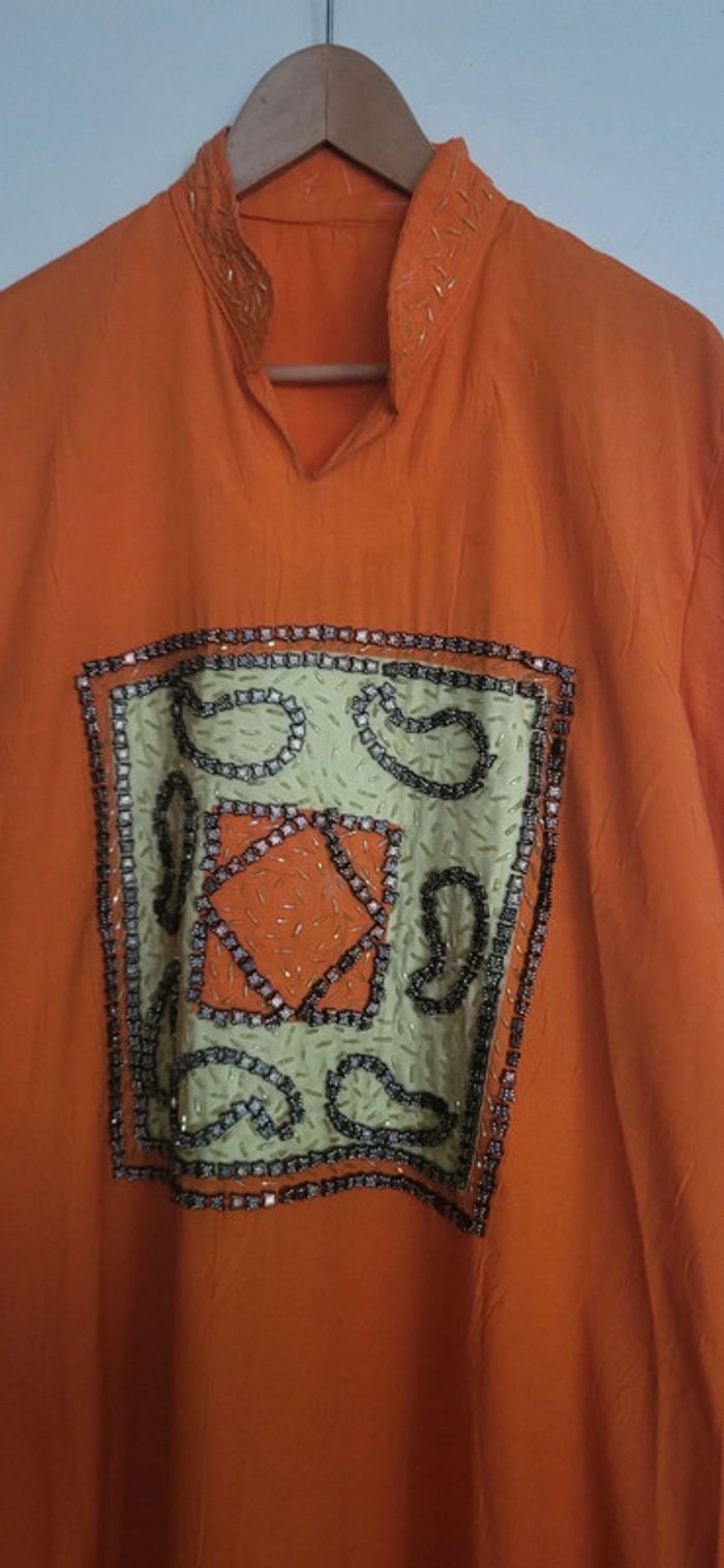 Magnifique robe oriental orange avec des détails en perles. Taille 44. En très bon état. Mensuration à plat : Epaule à epaule : 45cm Aisselle à Aisselle : 58cm Taille à plat : 58cm Longeur total : 138cm #echelon1844