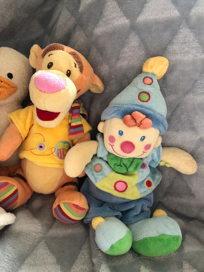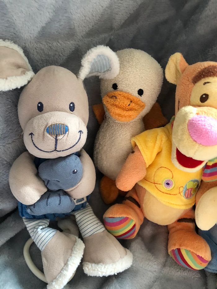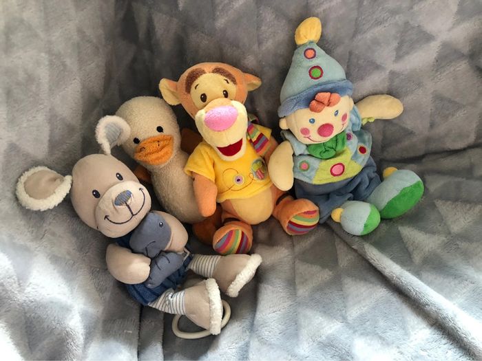 4 peluches dont 1 qui fait le sons d’une veilleuse Laver avant l’envoie 🧼
