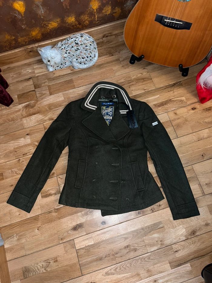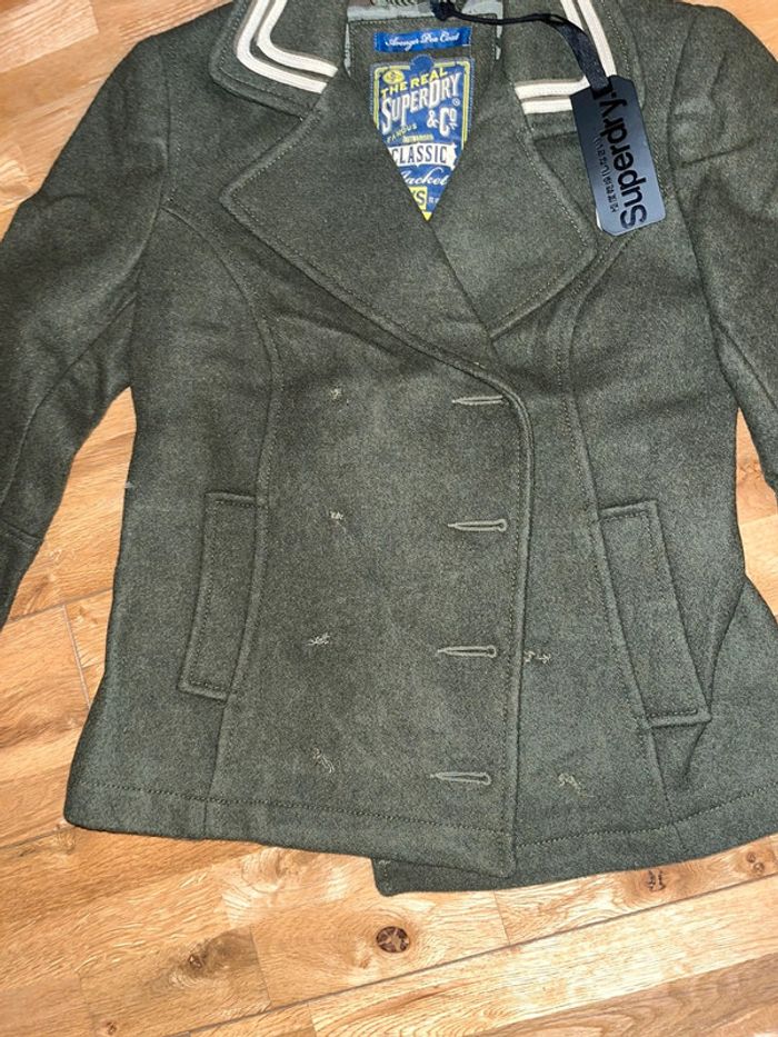 Belle veste kaki cintrée en laine Superdry Neuve achetée dans une vente attention il n’y a pas les boutons il faut les rajouter !!!! D’où le petit prix Xs