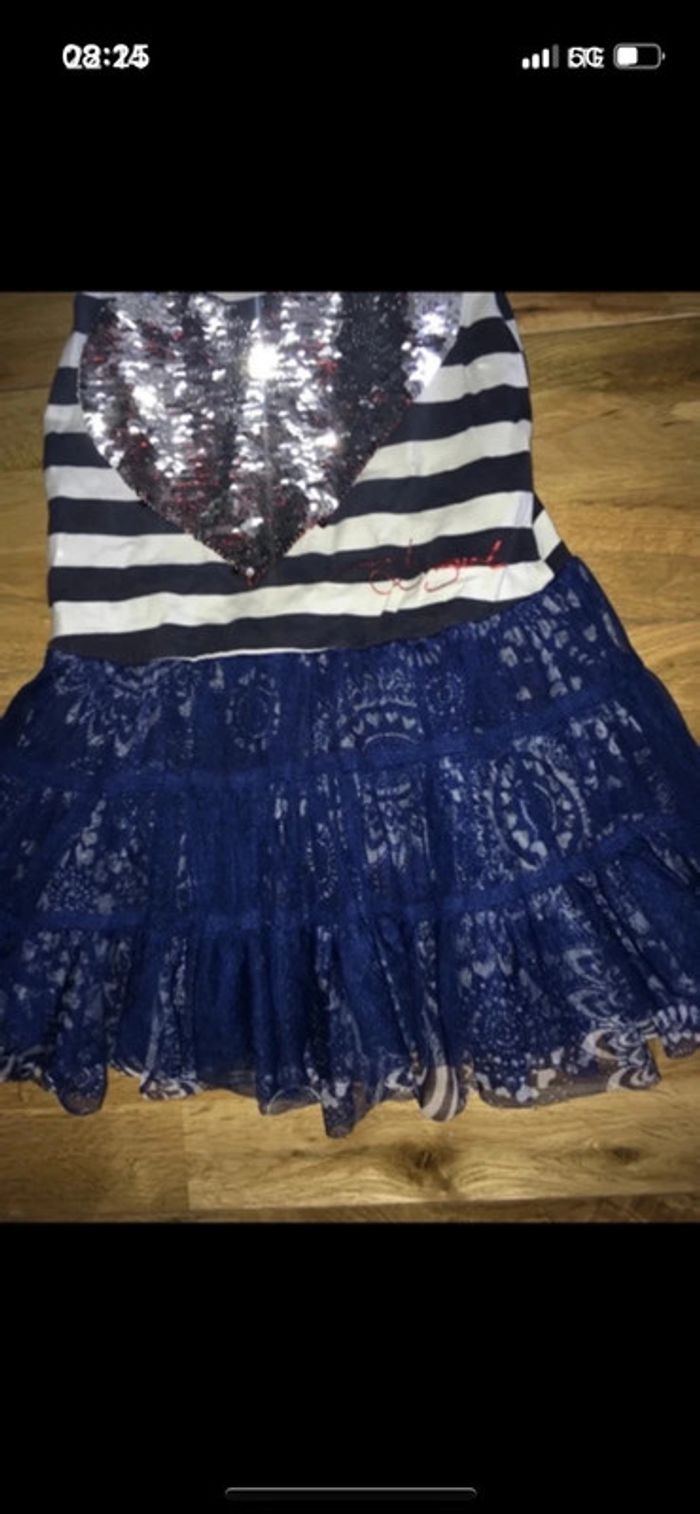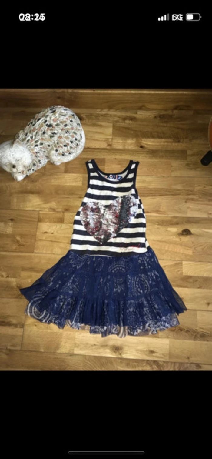 Jolie robe fente tons bleu et blanc gris cœur en paillettes Desigual Très bon état 3/4 ans N’hésitez pas à faire un tour dans mon dressing je fais des prix sur les lots ☺️