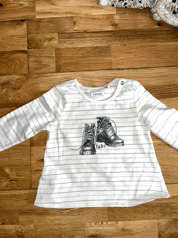 Joli t-shirt blanc ligné et motifs baskets Ikks Très bon état 12mois/74cm N’hésitez pas à faire un tour dans mon dressing je fais des prix sur les lots ☺️