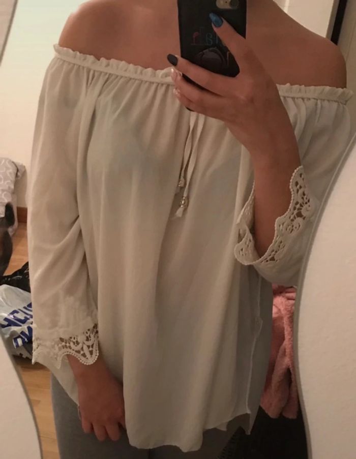 Belle blouse blanche, manche un peu plus long que 3/4 finissant par de la dentelle. A porter épaules dégagées ou non grâce au lien de serrage.