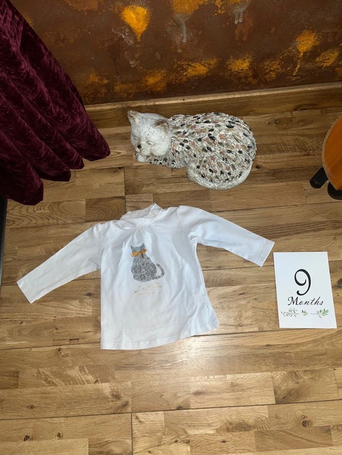 T-shirt blanc col roulé motif chat TAO 9 mois/71cm - photo numéro 1