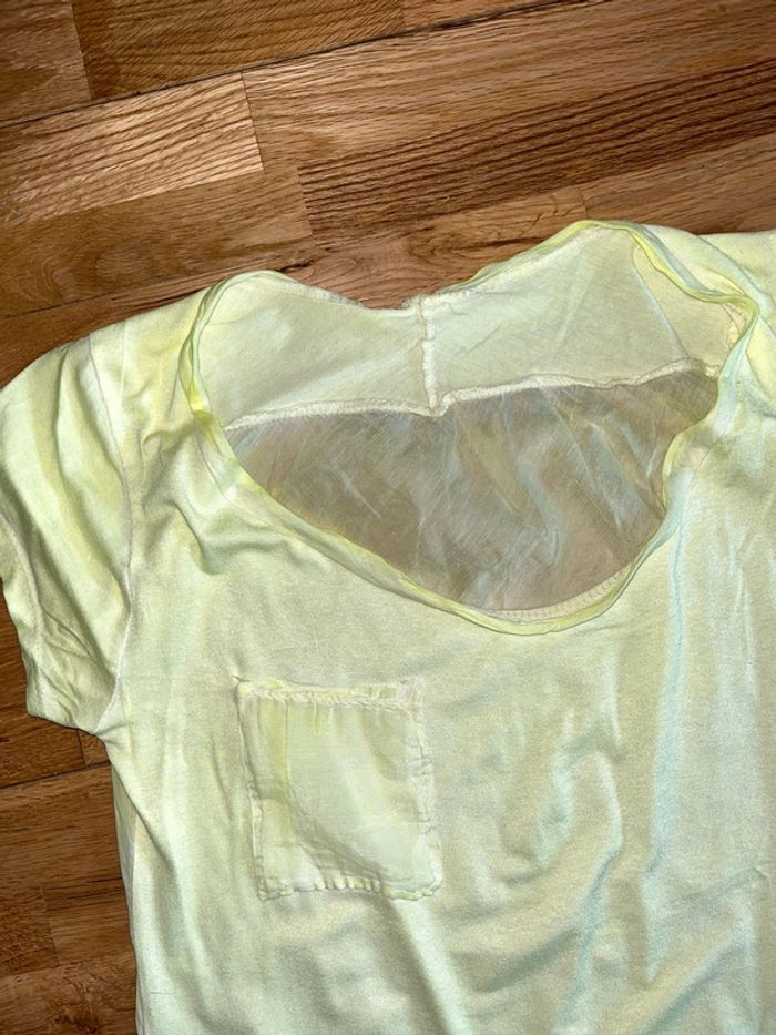 Joli t-shirt jaune pale un peu fluo Sans marque Dos un peu en transparence Pas d’étiquette mais ça pour un s Très bon état
