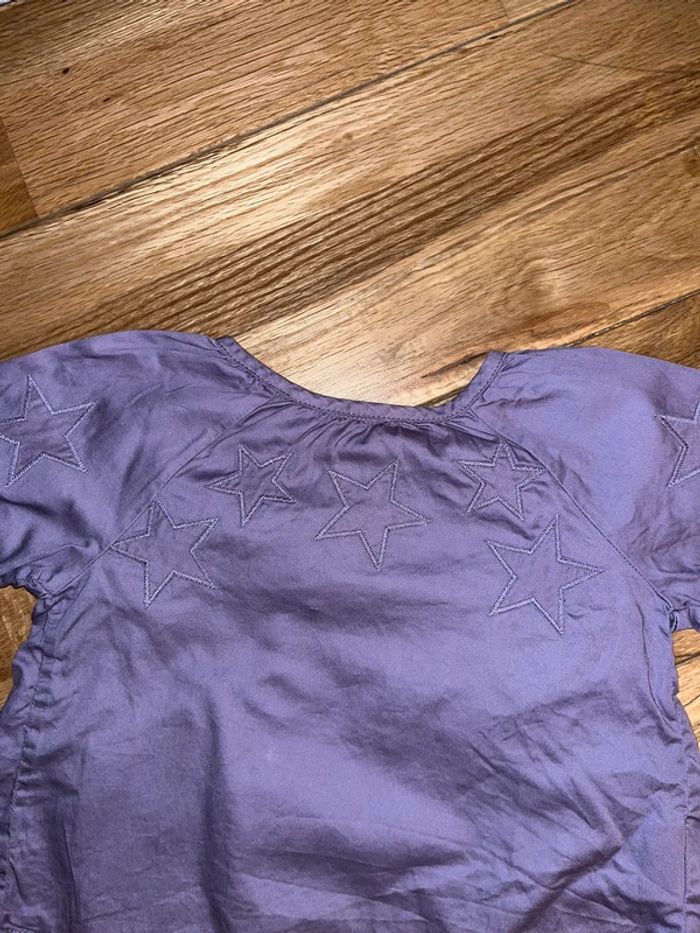 Joli chemisier mauve Motifs étoiles brodées Ferme par des boutons dans le dos Dpm 12mois N’hésitez pas à faire un tour dans mon dressing je fais des prix sur les lots ☺️