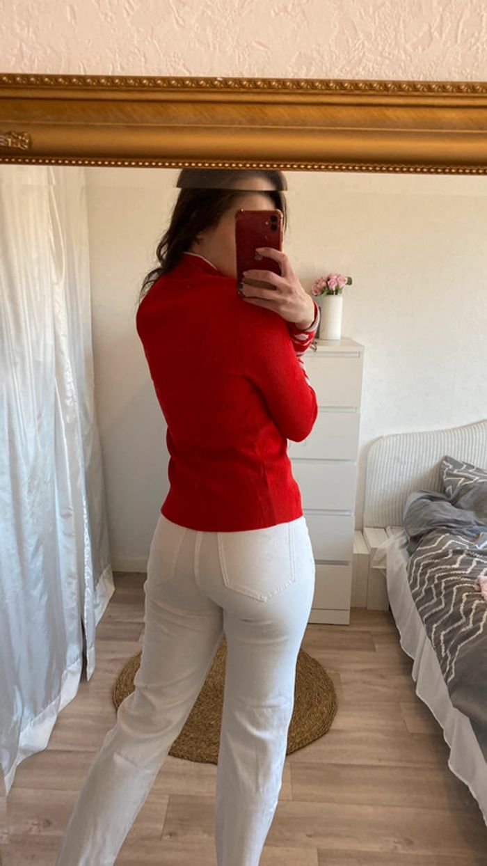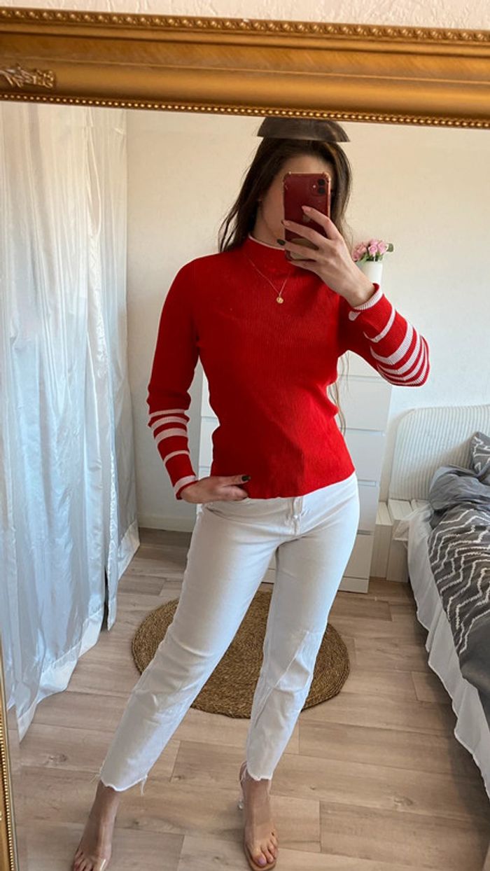 Pull côtelé avec col haut, rouge avec des bandes blanche sur les manches #mojito1Taille38