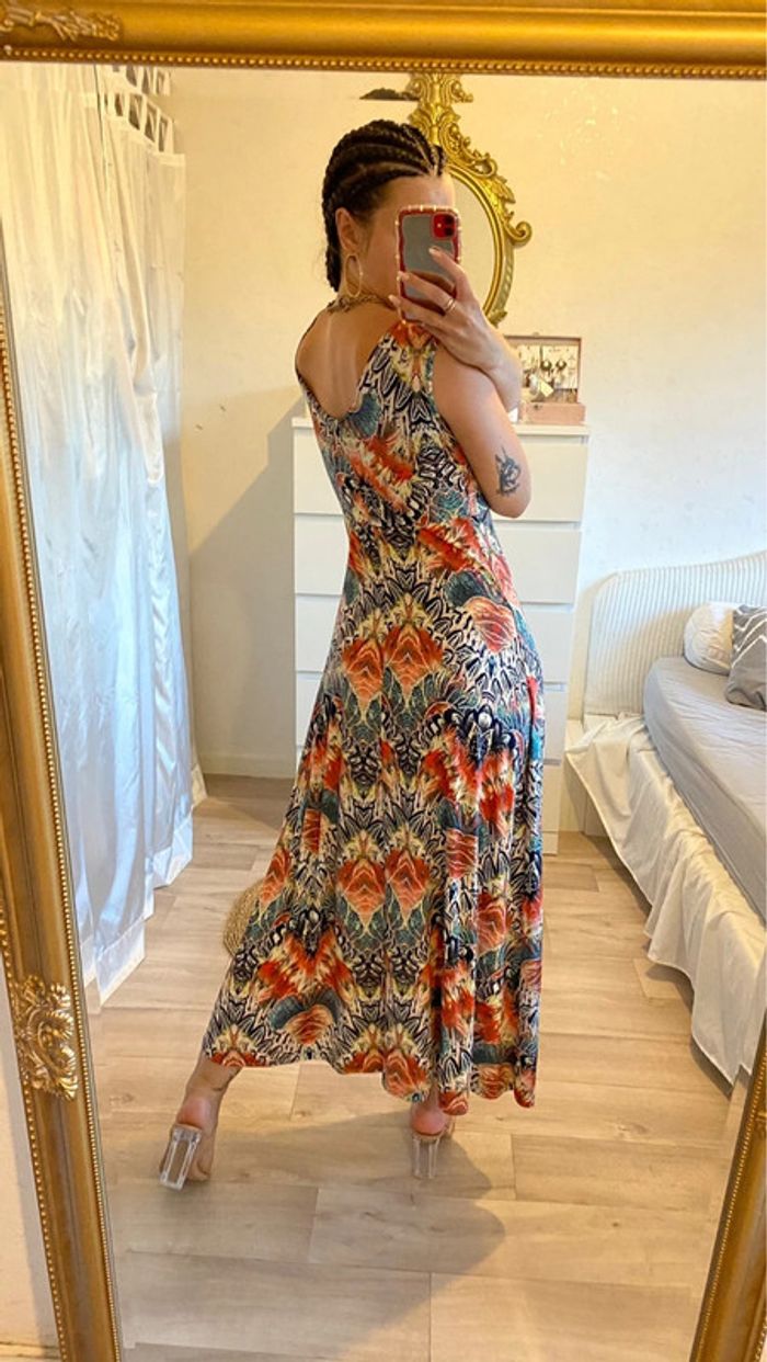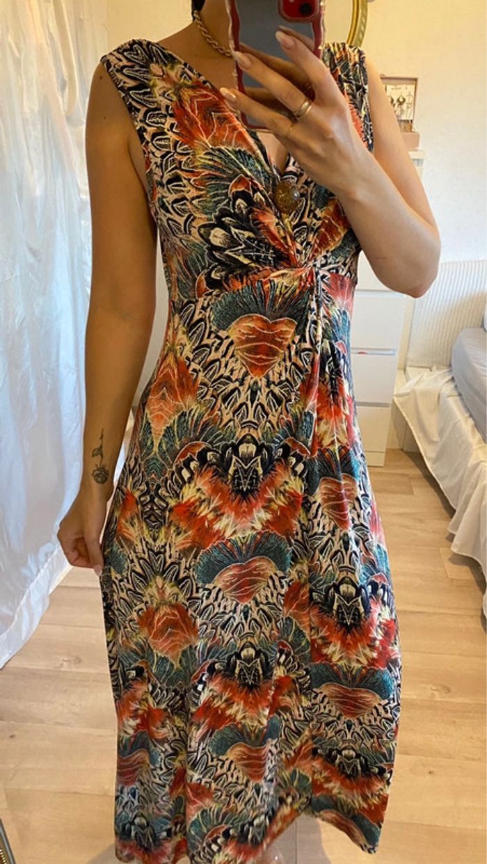Robe fluide légère matière élastique et agréable à porté. Une broche est mise pour diminuer le décolleté mais peut être enlever #mojito1Taille38