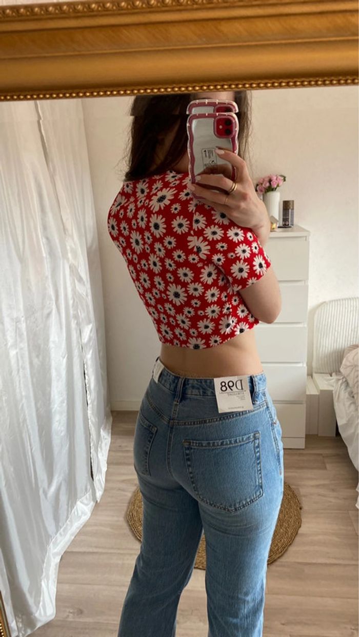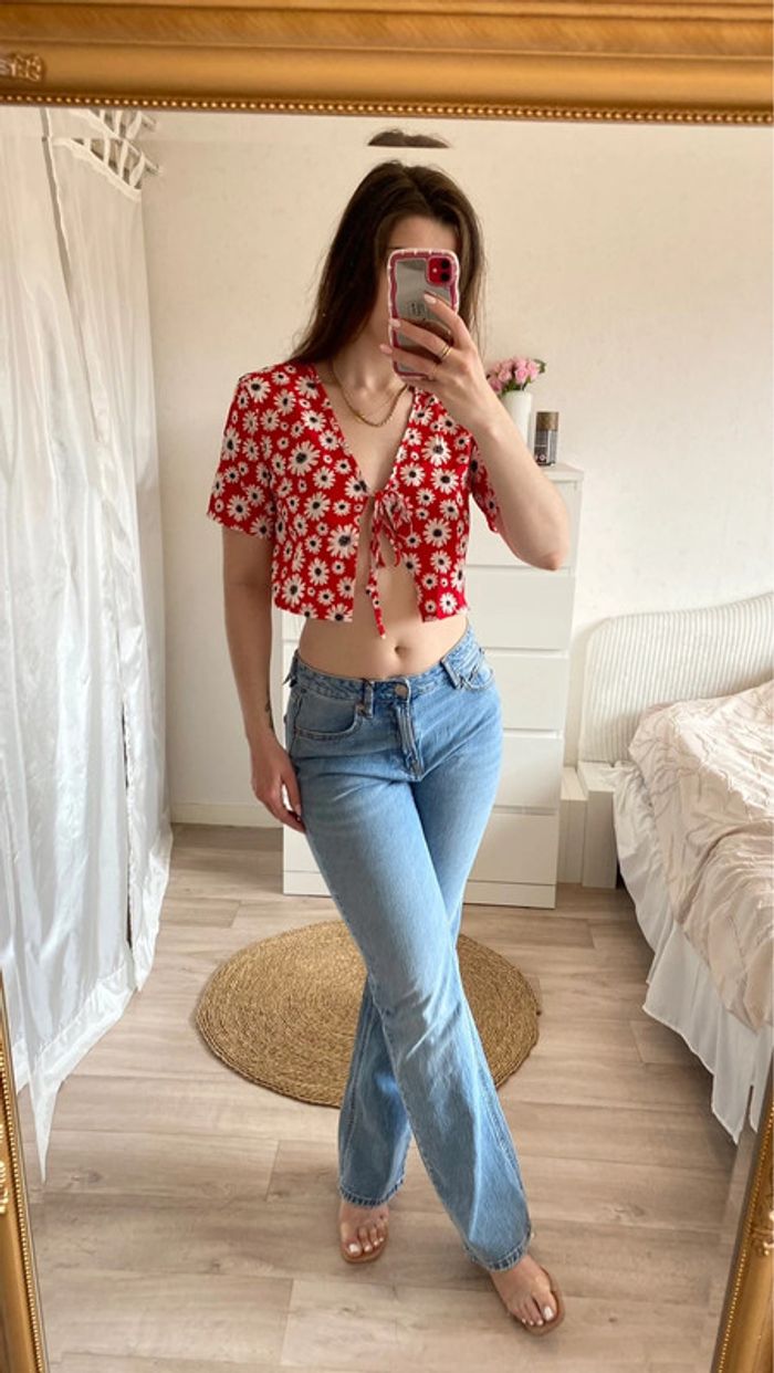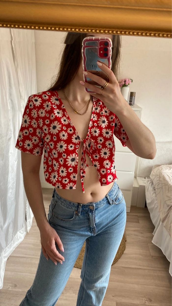 Petit gilet fleurie rouge, un lacet devant, manches courtes #mojito1Taille36