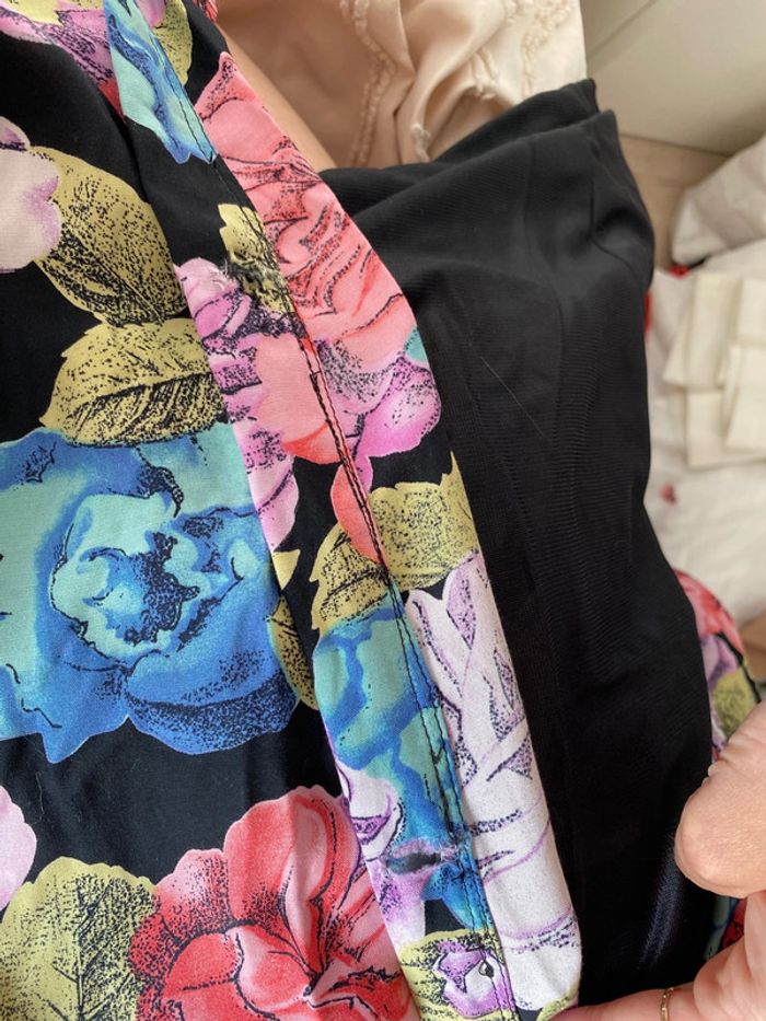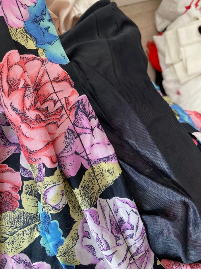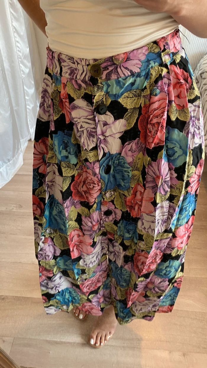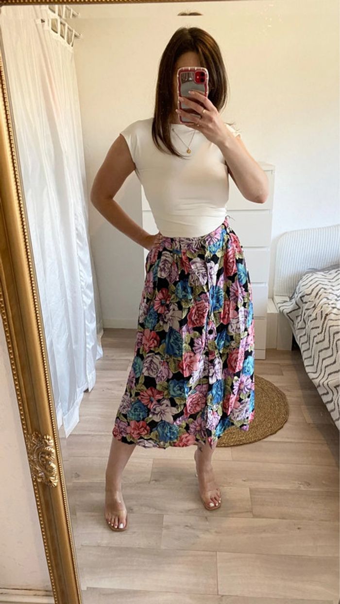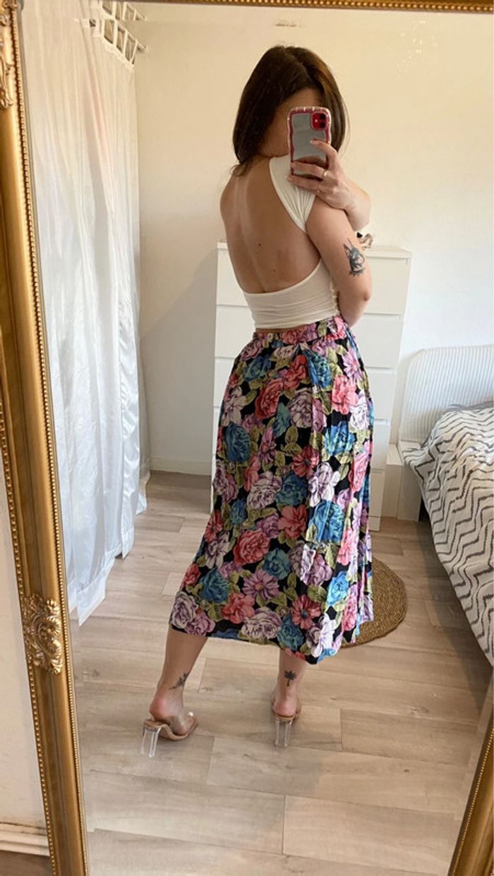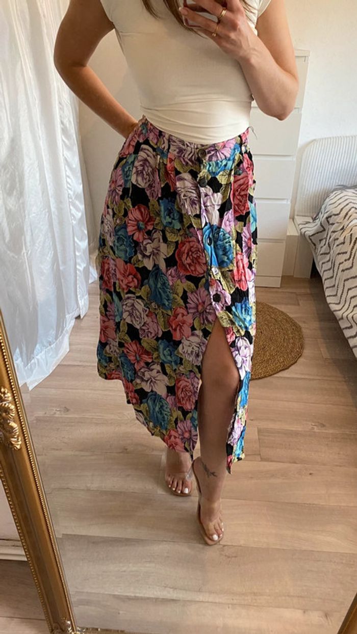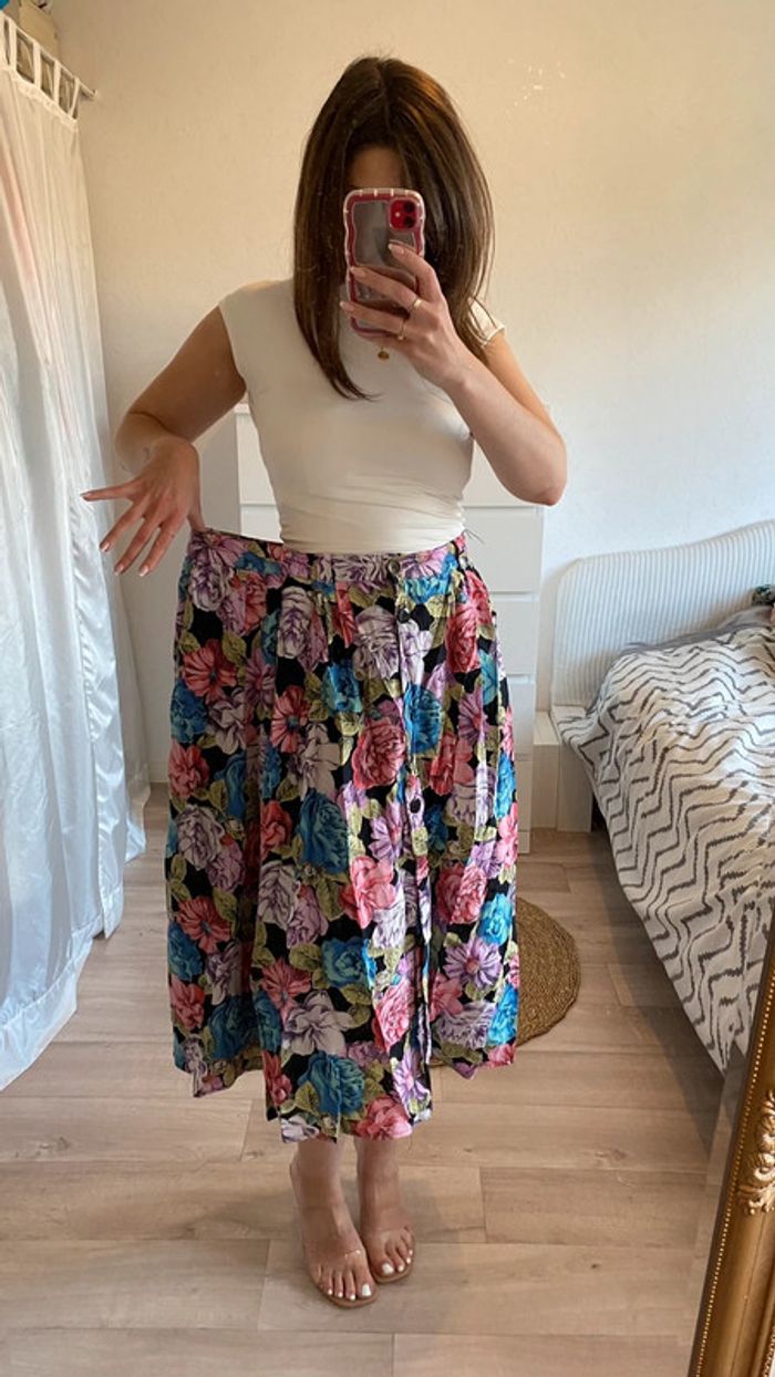Taille 44. Possède des passants pour mettre une ceinture. La boutonnière n’a pas tout les boutons mais au moins jusqu’à la moitié donc se porte avec une fente/ ouverture devant (ou vous rajouter deux boutons) la jupe a été modifiée donc les finitions intérieur sur la boutonnière sont pas très belle (voir dernières photos) mais c’est que l’intérieur donc ont ne voit rien porté Taille à plat : 43cm #mojito1Taille44