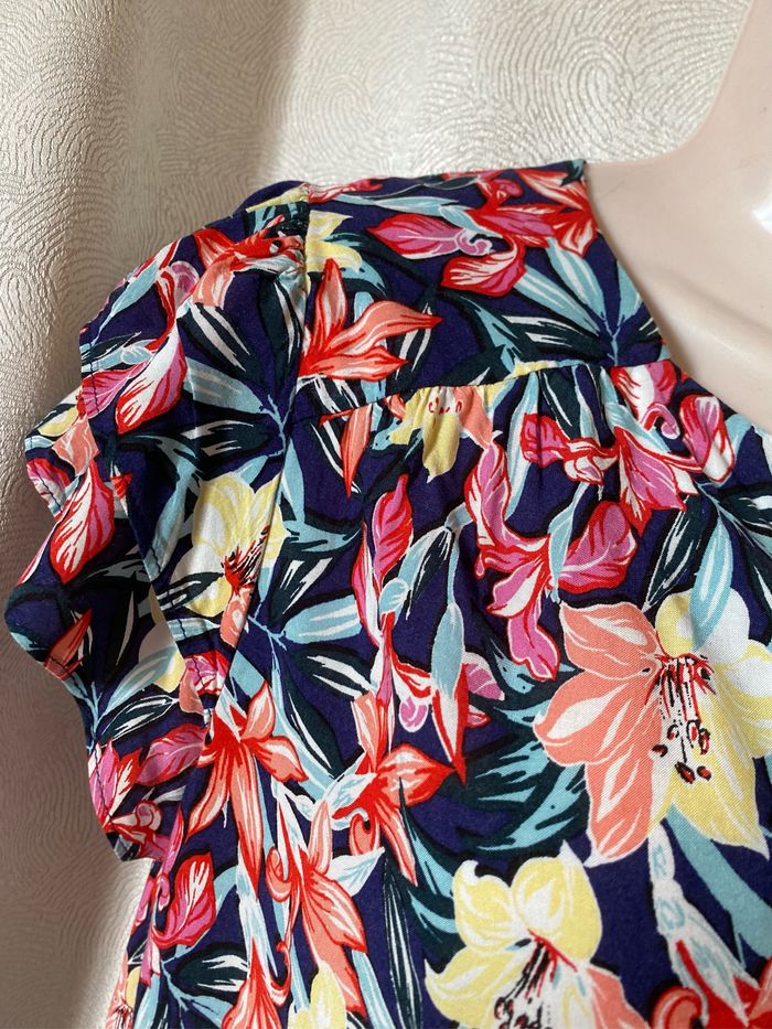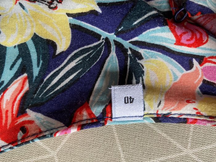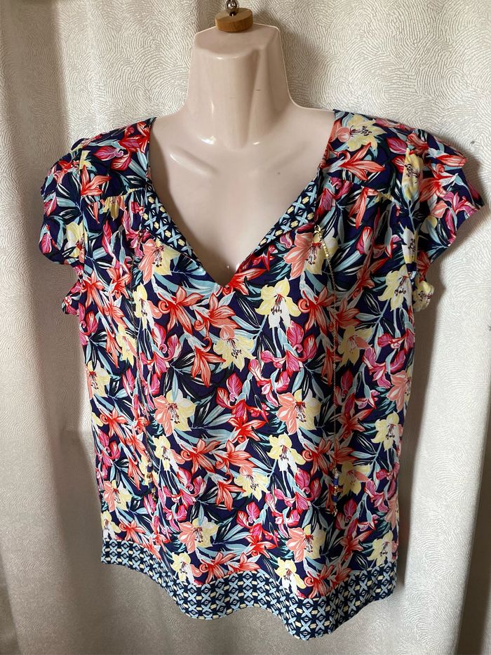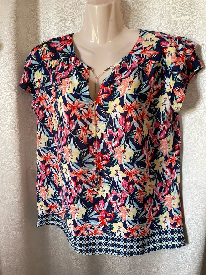 Tunique fleurie avec chaîne perles 40 100% viscose Longueur 61 cm Aisselle à aisselle 51,5 cm Carrure couture à couture 37,5 cm Largeur à plat en bas 53,5 cm