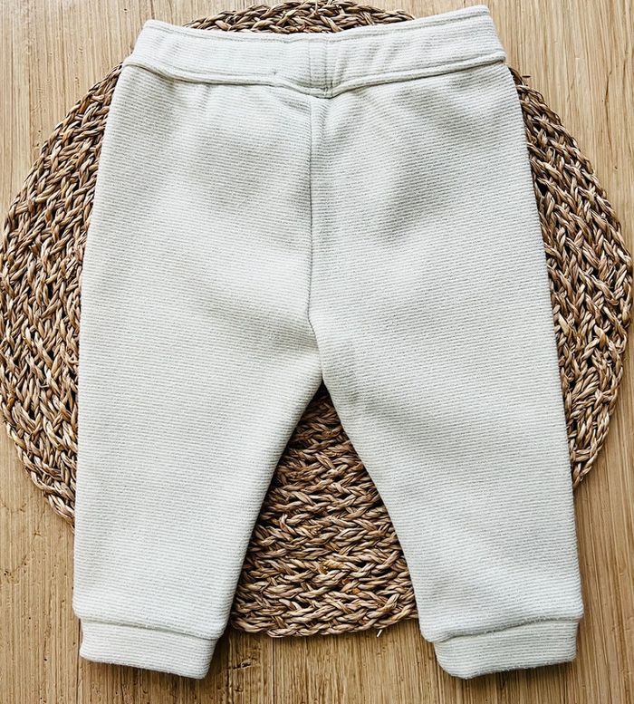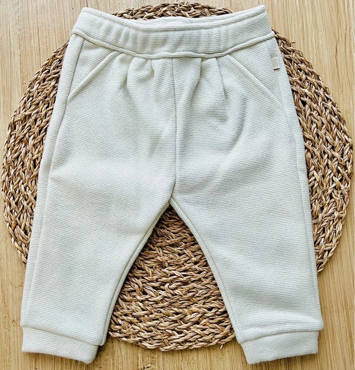 Pantalon molleton confort de la marque Obaïbi en très bon état. Pantalon style jogging en molleton doux, ceinture plate à pinces, 2 poches factices à l’avant, coloris écru rayé doré, taille : 9mois/71cm. Valeur neuf : 15,99€ Envoi rapide et soigné 📦