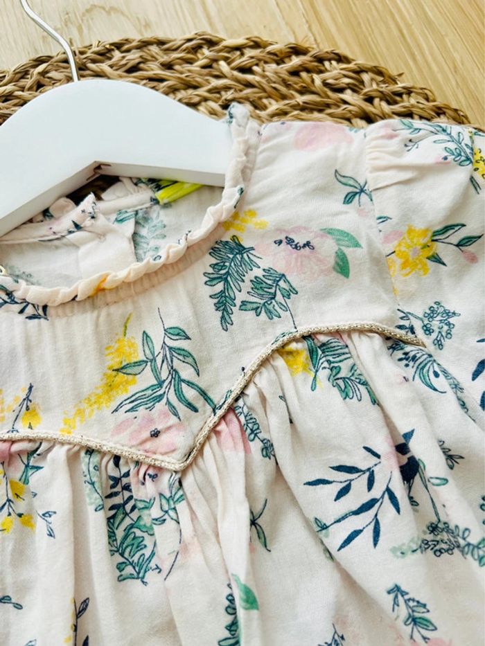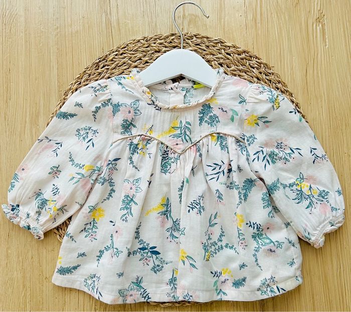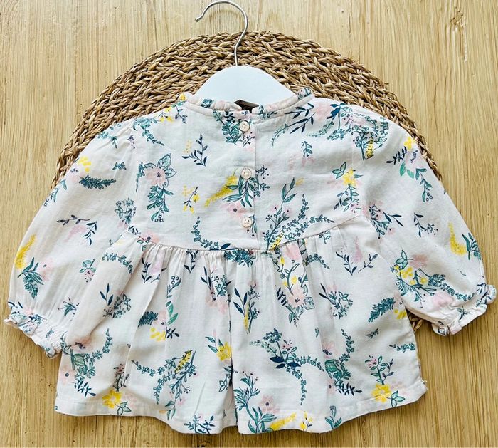 Blouse imprimé fleurs de la marque Tape à l’Oeil en très bon état. Blouse/chemise en coton, manches longues bouffantes avec poignets élastiqués et volantés, ouverture par 3 boutons au dos, col avec fronces, coloris rose clair avec imprimé fleuri et surpiqûre dorée sur la poitrine, taille : 9mois/71cm Valeur neuve : 17,99€ Envoi rapide et soigné 📦