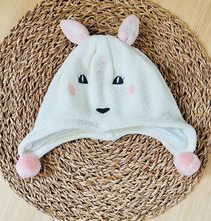 Bonnet lapin de la marque Orchestra en très bon état. Bonnet en tricot très doux à caches-oreilles, doublure en jersey, oreilles en relief sur le dessus, détails brodés, pompons sur les côtés, taille : 12-18mois/47cm. Valeur neuf : 14,99€ Envoi rapide et soigné 📦