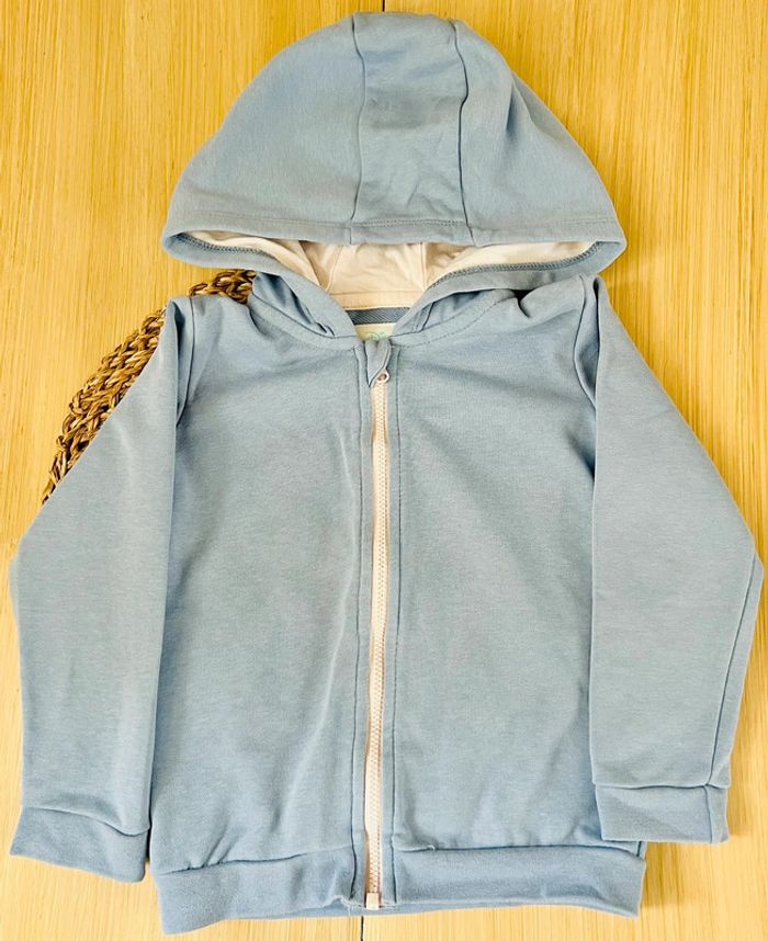 Sweat-shirt à capuche de la marque Disney baby en très bon état. Gilet zippé avec fermeture contrastée rose clair, capuche à intérieur contrasté rose clair, coloris bleu ciel et grand imprimé Minnie Mouse dans le dos, taille : 12-24 mois / 86-92cm. Envoi rapide et soigné 📦