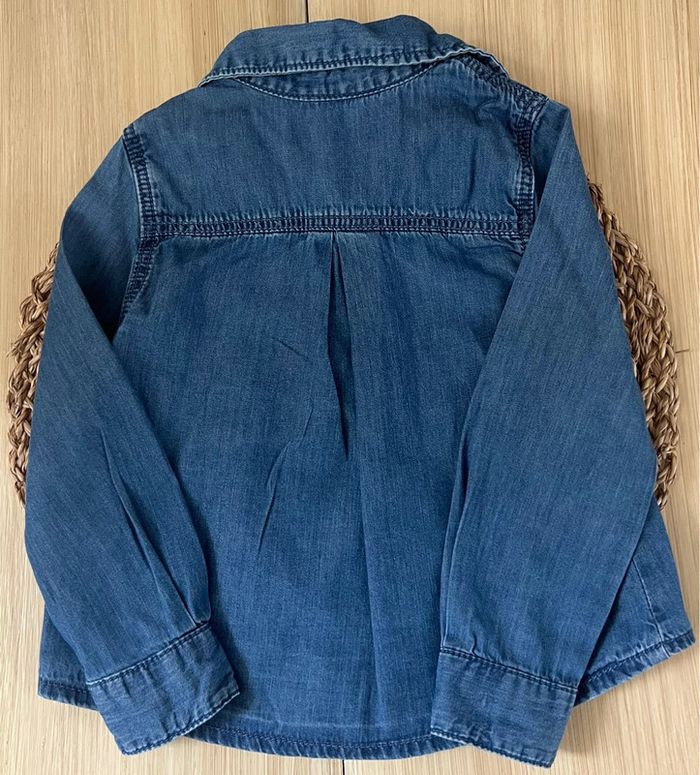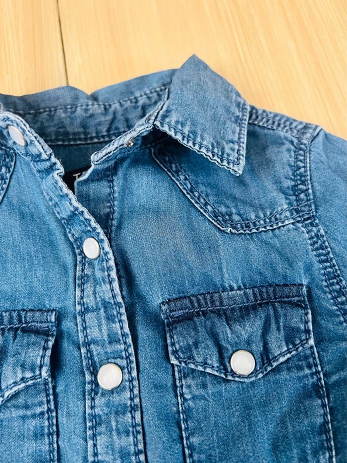 Chemise jeans de la marque TEX en très bon état. Chemise en denim, coupe ajustée, col chemise, manches longues avec poignets boutonnés, 2 poches à rabat avec bouton sur la poitrine, fermeture à l’avant à boutons-pression, coutures décoratives, taille : 2-3 ans Envoi rapide et soigné 📦